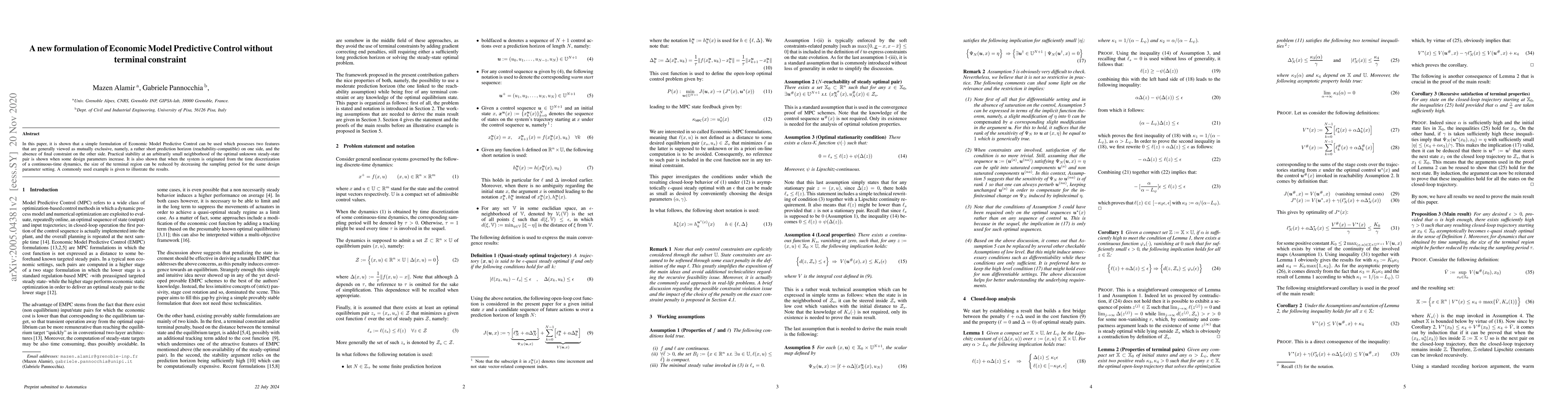 In this paper, it is shown that a simple formulation of Economic Model Predictive Control can be used which possesses two features that are generally viewed as mutually exclusive, namely, a rather short prediction horizon (reachability-compatible) on one side, and the absence of final constraint on the other side. The result holds for discrete-time models that are originated from continuous-time models by means of discretization. Practical stability at a small neighborhood of the optimal unknown steady-state pair is shown when some parameters increase and sampling time decreases. A commonly used example is given to illustrate the result.