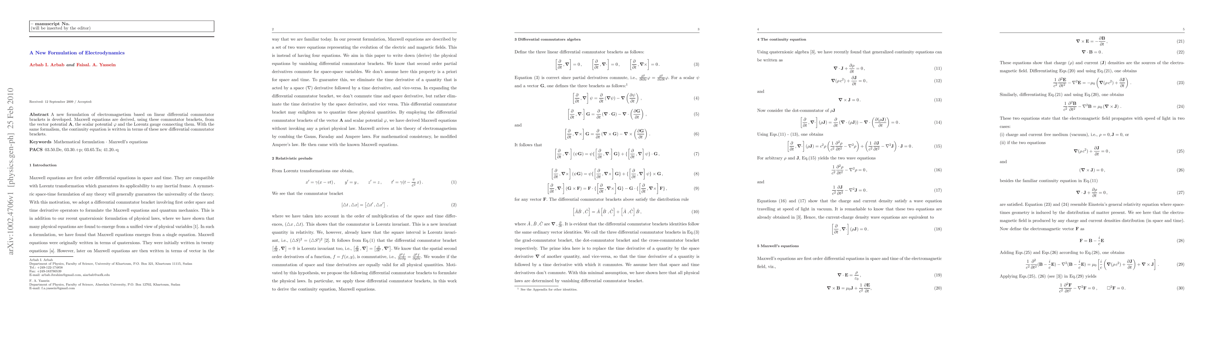 A new formulation of electromagnetism based on linear differential commutator brackets is developed. Maxwell equations are derived, using these commutator brackets, from the vector potential $\vec{A}$, the scalar potential $\phi$ and the Lorentz gauge connecting them. With the same formalism, the continuity equation is written in terms of these new differential commutator brackets. Keywords: Mathematical formulation, Maxwell's equations