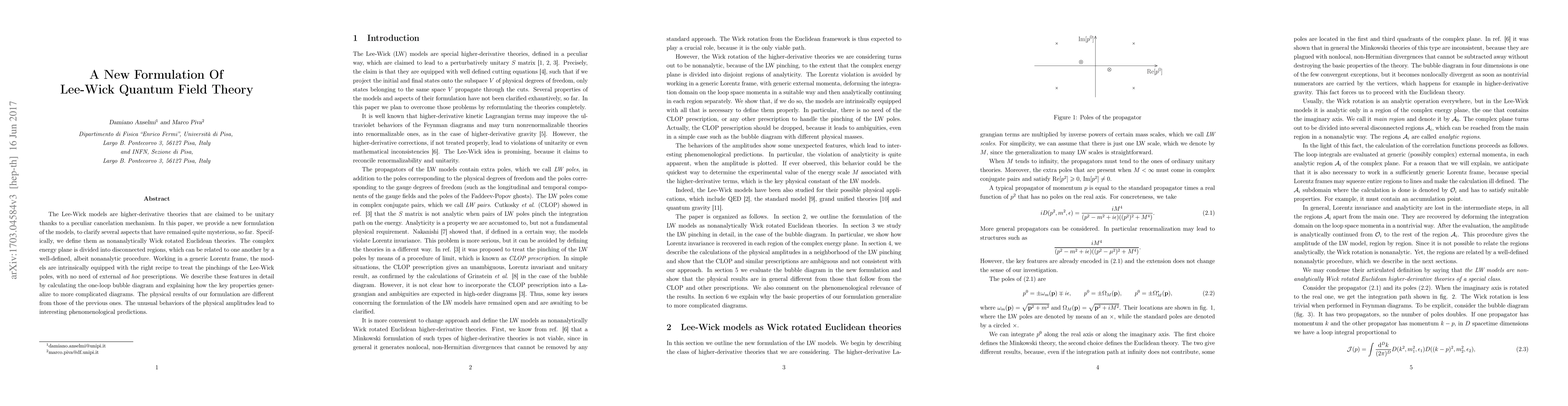 The Lee-Wick models are higher-derivative theories that are claimed to be unitary thanks to a peculiar cancelation mechanism. In this paper, we provide a new formulation of the models, to clarify several aspects that have remained quite mysterious, so far. Specifically, we define them as nonanalytically Wick rotated Euclidean theories. The complex energy plane is divided into disconnected regions, which can be related to one another by a well-defined, albeit nonanalytic procedure. Working in a generic Lorentz frame, the models are intrinsically equipped with the right recipe to treat the pinchings of the Lee-Wick poles, with no need of external ad hoc prescriptions. We describe these features in detail by calculating the one-loop bubble diagram and explaining how the key properties generalize to more complicated diagrams. The physical results of our formulation are different from those of the previous ones. The unusual behaviors of the physical amplitudes lead to interesting phenomenological predictions.