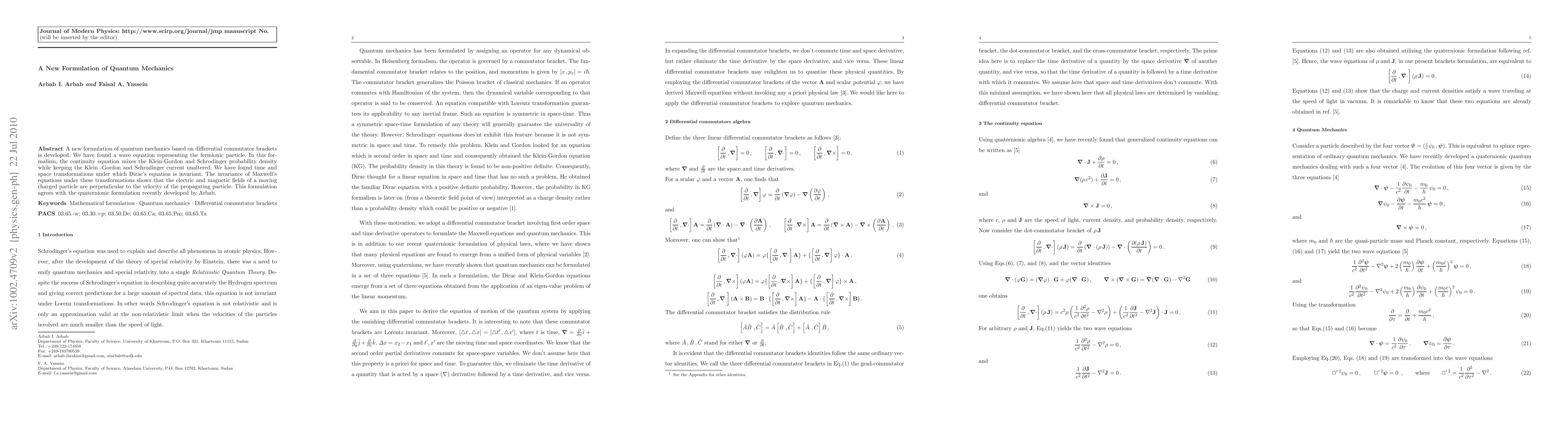 A novel quantum mechanics formulation uses differential commutator brackets, deriving a fermionic particle wave equation. This mixes Klein-Gordon and Schrödinger densities while preserving their currents. The work identifies transformations maintaining Dirac's and Maxwell's equations, aligning with a recent quaternionic formulation by Arbab, suggesting new insights into particle behavior.