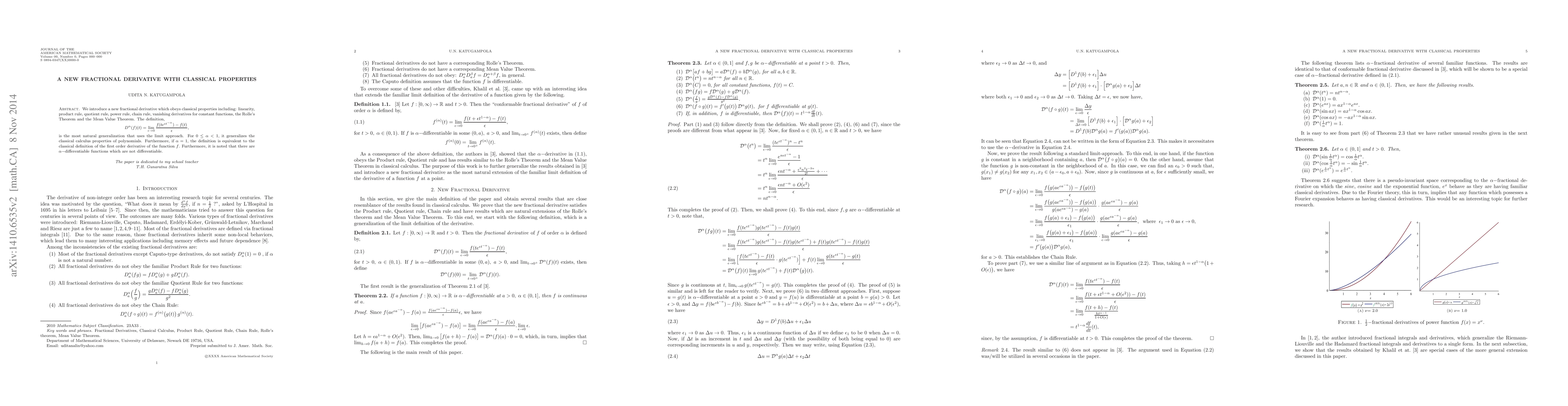 We introduce a new fractional derivative which obeys classical properties including: linearity, product rule, quotient rule, power rule, chain rule, vanishing derivatives for constant functions, the Rolle's Theorem and the Mean Value Theorem. The definition, \[ D^\alpha (f)(t) = \lim_{\epsilon \rightarrow 0} \frac{f(te^{\epsilon t^{-\alpha}}) - f(t)}{\epsilon}, \] is the most natural generalization that uses the limit approach. For $0\leq \alpha < 1$, it generalizes the classical calculus properties of polynomials. Furthermore, if $\alpha = 1$, the definition is equivalent to the classical definition of the first order derivative of the function $f$. Furthermore, it is noted that there are $\alpha-$differentiable functions which are not differentiable.