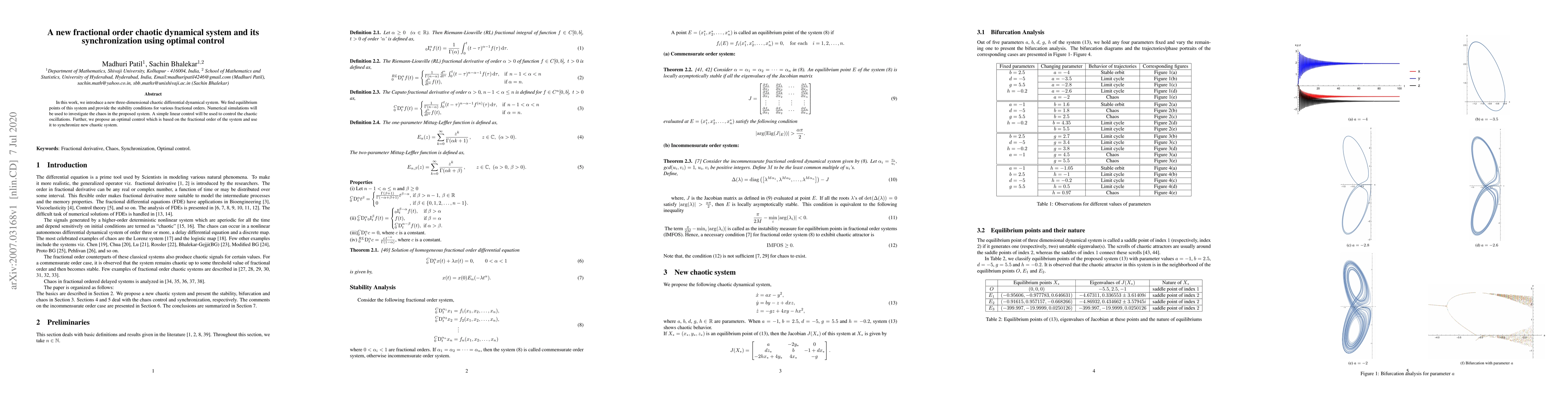 In this work, we introduce a new three-dimensional chaotic differential dynamical system. We find equilibrium points of this system and provide the stability conditions for various fractional orders. Numerical simulations will be used to investigate the chaos in the proposed system. A simple linear control will be used to control the chaotic oscillations. Further, we propose an optimal control which is based on the fractional order of the system and use it to synchronize new chaotic system.
