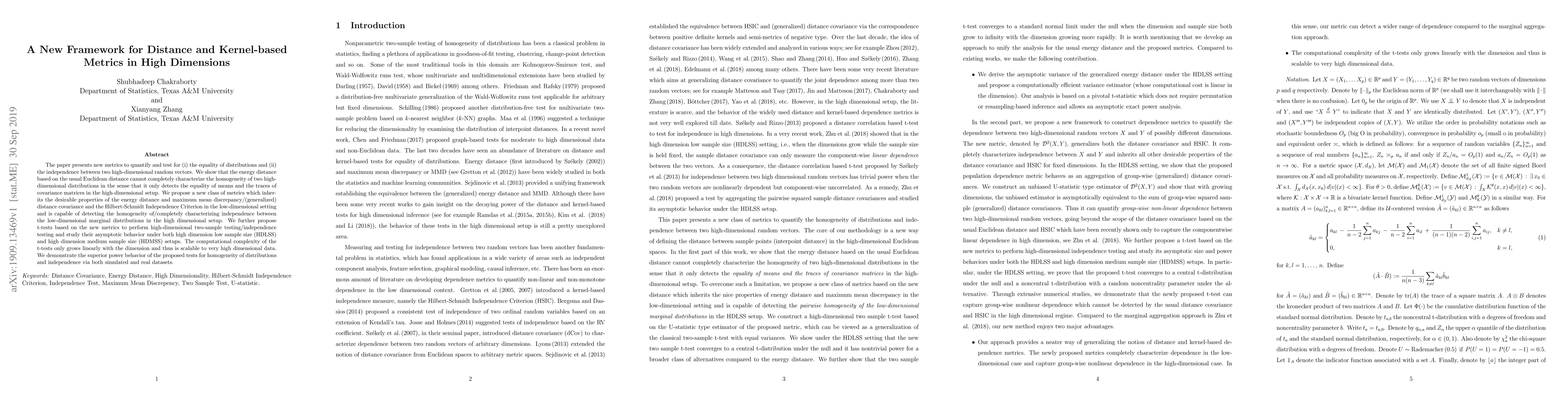 New metrics for high-dimensional data analysis can detect distribution equality and independence with improved power and scalability compared to existing methods.