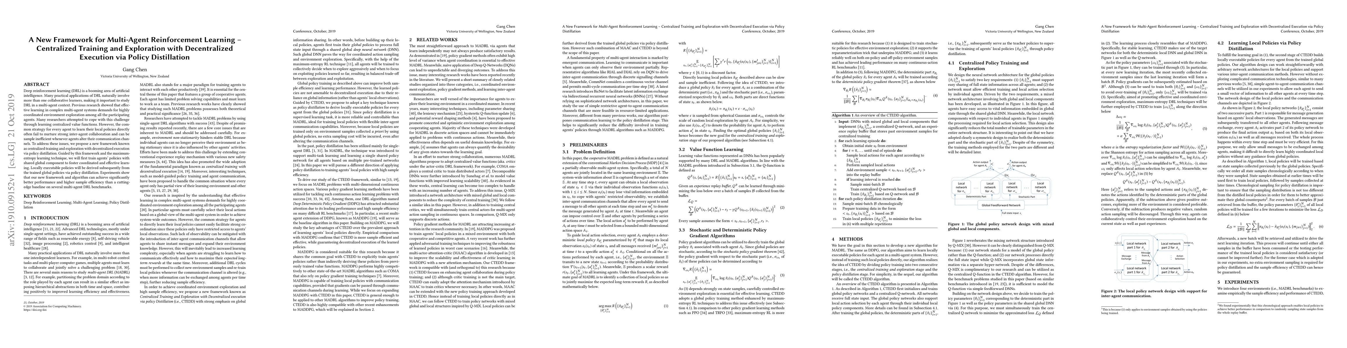 Deep reinforcement learning (DRL) is a booming area of artificial intelligence. Many practical applications of DRL naturally involve more than one collaborative learners, making it important to study DRL in a multi-agent context. Previous research showed that effective learning in complex multi-agent systems demands for highly coordinated environment exploration among all the participating agents. Many researchers attempted to cope with this challenge through learning centralized value functions. However, the common strategy for every agent to learn their local policies directly often fail to nurture strong inter-agent collaboration and can be sample inefficient whenever agents alter their communication channels. To address these issues, we propose a new framework known as centralized training and exploration with decentralized execution via policy distillation. Guided by this framework and the maximum-entropy learning technique, we will first train agents' policies with shared global component to foster coordinated and effective learning. Locally executable policies will be derived subsequently from the trained global policies via policy distillation. Experiments show that our new framework and algorithm can achieve significantly better performance and higher sample efficiency than a cutting-edge baseline on several multi-agent DRL benchmarks.
