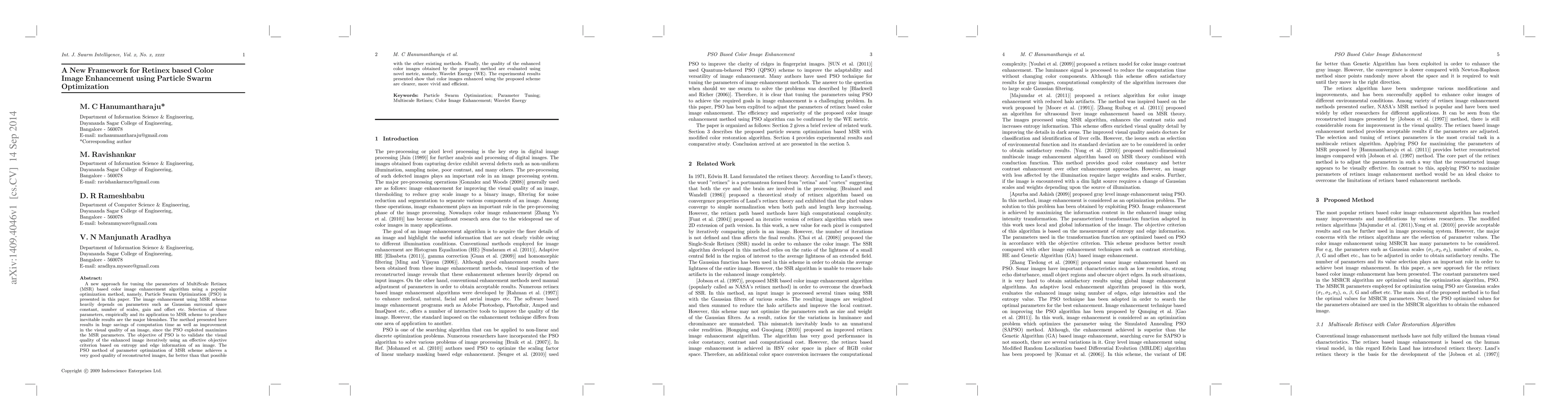 This paper introduces a new framework for enhancing color images using MultiScale Retinex (MSR) with Particle Swarm Optimization (PSO) to optimize its parameters, achieving significant improvements in visual quality and computational efficiency compared to existing methods. The proposed PSO-based optimization is validated using entropy and edge information, and results are further evaluated using the Wavelet Energy metric.