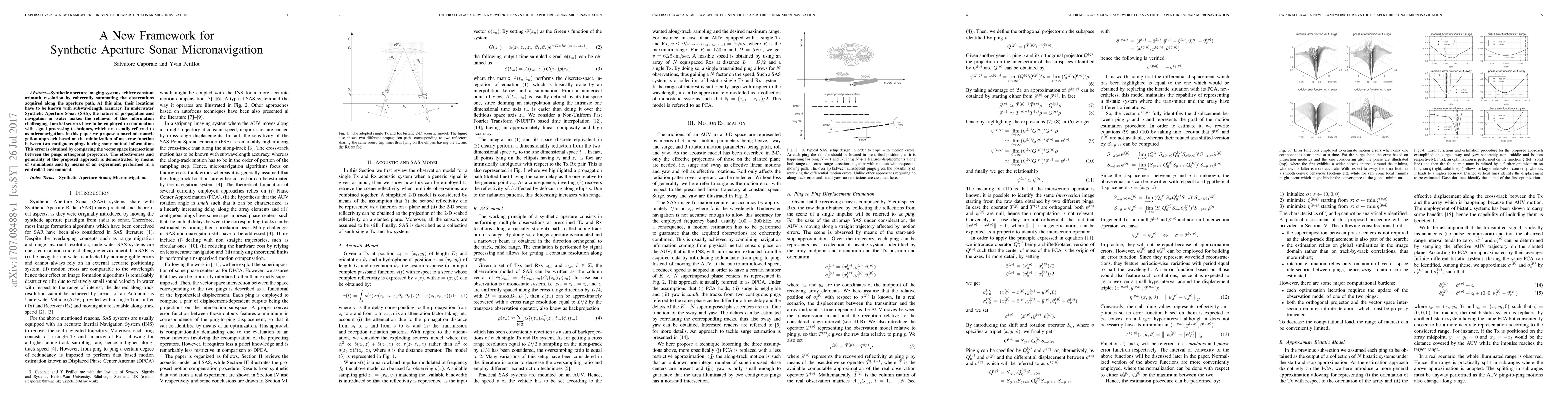 Synthetic aperture imaging systems achieve constant azimuth resolution by coherently summating the observations acquired along the aperture path. At this aim, their locations have to be known with subwavelength accuracy. In underwater Synthetic Aperture Sonar (SAS), the nature of propagation and navigation in water makes the retrieval of this information challenging. Inertial sensors have to be employed in combination with signal processing techniques, which are usually referred to as micronavigation. In this paper we propose a novel micronavigation approach based on the minimization of an error function between two contiguous pings having some mutual information. This error is obtained by comparing the vector space intersections between the pings orthogonal projectors. The effectiveness and generality of the proposed approach is demonstrated by means of simulations and by means of an experiment performed in a controlled environment.