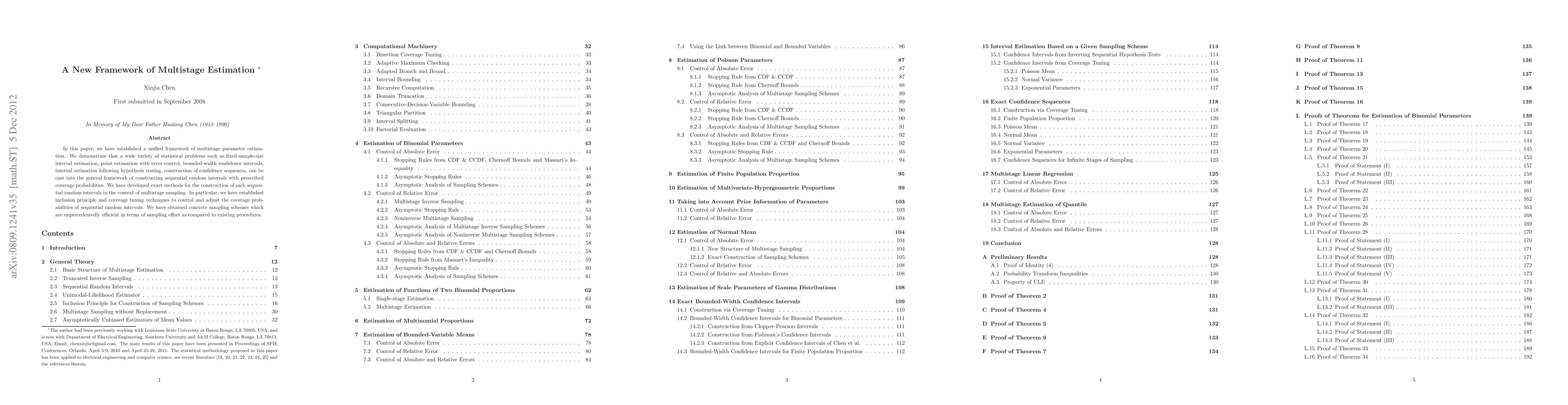 This paper introduces a unified framework for multistage parameter estimation, demonstrating its applicability to various statistical problems through sequential random intervals with precise coverage probabilities. It presents efficient sampling schemes using inclusion principles and coverage tuning techniques, outperforming existing methods in sampling effort.