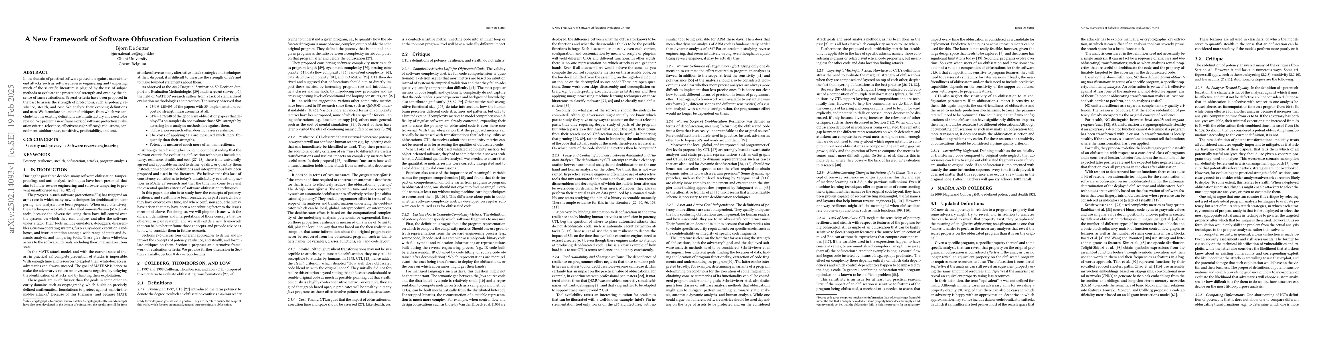 The paper critiques existing obfuscation evaluation criteria and proposes a new framework, analyzing evolving definitions and uses of potency, resilience, stealth, and cost, concluding that revisions are necessary.