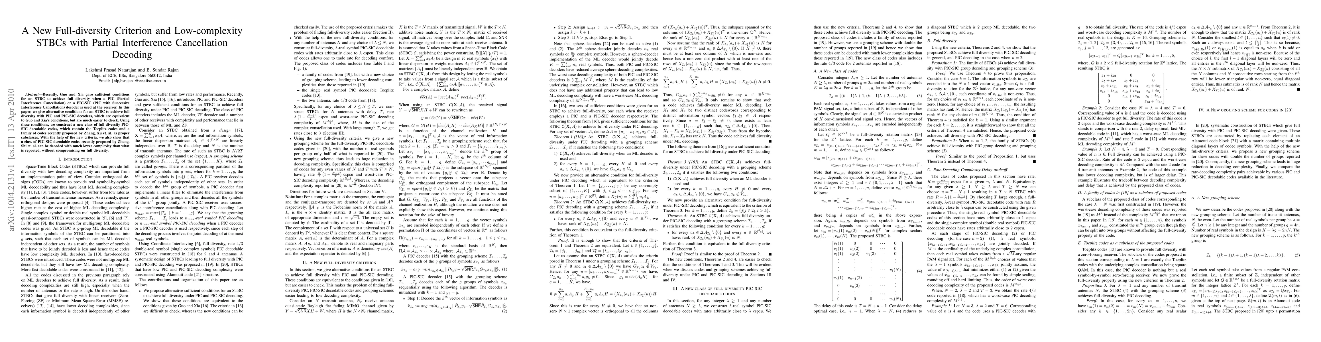 Recently, Guo and Xia gave sufficient conditions for an STBC to achieve full diversity when a PIC (Partial Interference Cancellation) or a PIC-SIC (PIC with Successive Interference Cancellation) decoder is used at the receiver. In this paper, we give alternative conditions for an STBC to achieve full diversity with PIC and PIC-SIC decoders, which are equivalent to Guo and Xia's conditions, but are much easier to check. Using these conditions, we construct a new class of full diversity PIC-SIC decodable codes, which contain the Toeplitz codes and a family of codes recently proposed by Zhang, Xu et. al. as proper subclasses. With the help of the new criteria, we also show that a class of PIC-SIC decodable codes recently proposed by Zhang, Shi et. al. can be decoded with much lower complexity than what is reported, without compromising on full diversity.