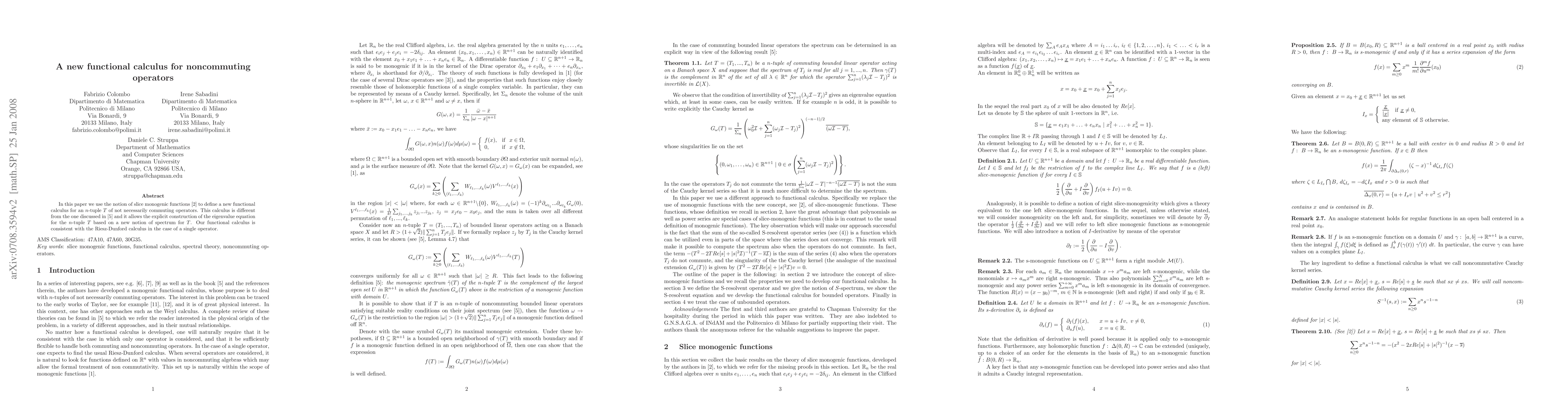 In this paper we use the notion of slice monogenic functions \cite{slicecss} to define a new functional calculus for an $n$-tuple $T$ of not necessarily commuting operators. This calculus is different from the one discussed in \cite{jefferies} and it allows the explicit construction of the eigenvalue equation for the $n$-tuple $T$ based on a new notion of spectrum for $T$. Our functional calculus is consistent with the Riesz-Dunford calculus in the case of a single operator.