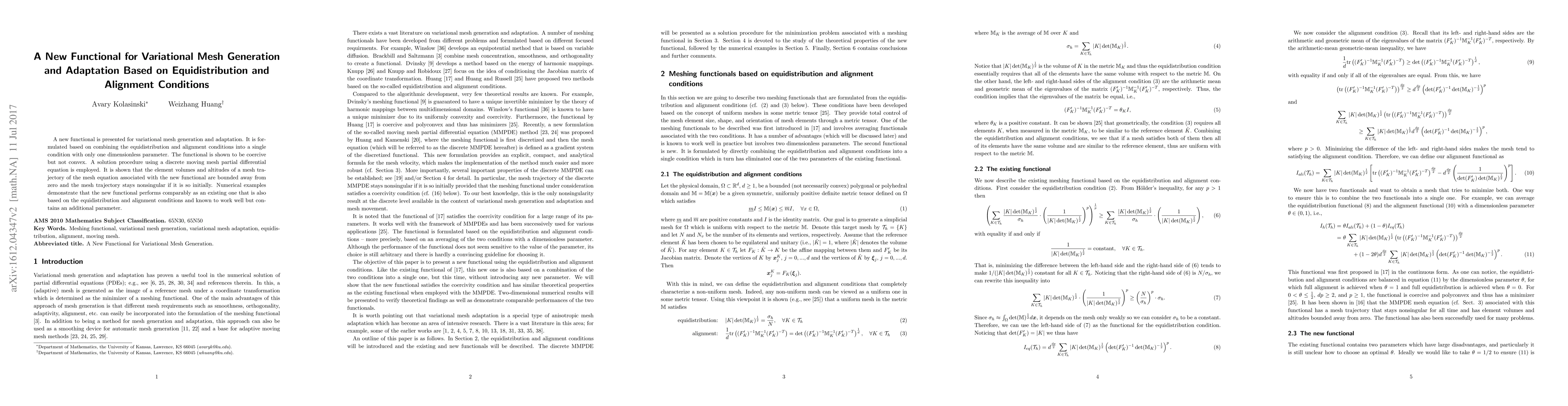 A new functional is presented for variational mesh generation and adaptation. It is formulated based on combining the equidistribution and alignment conditions into a single condition with only one dimensionless parameter. The functional is shown to be coercive but not convex. A solution procedure using a discrete moving mesh partial differential equation is employed. It is shown that the element volumes and altitudes of a mesh trajectory of the mesh equation associated with the new functional are bounded away from zero and the mesh trajectory stays nonsingular if it is so initially. Numerical examples demonstrate that the new functional performs comparably as an existing one that is also based on the equidistribution and alignment conditions and known to work well but contains an additional parameter.