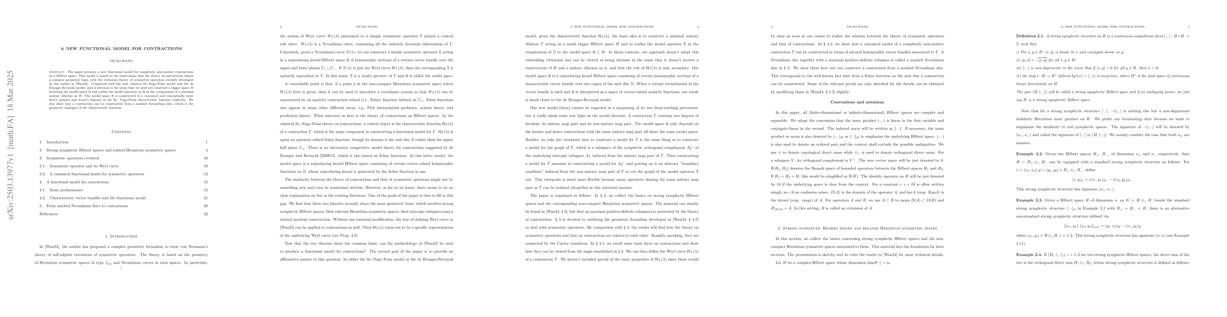 The paper presents a new functional model for completely non-unitary contractions on a Hilbert space, based on a geometric approach that avoids the need for a larger space and explicit characteristic functions, unlike classical models.