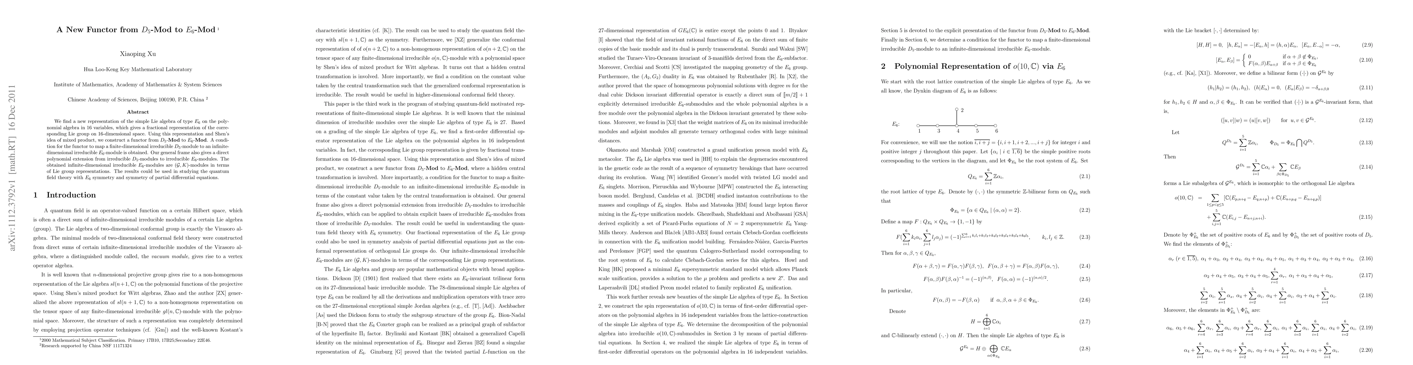 This paper introduces a new representation of the $E_6$ Lie algebra on a 16-variable polynomial algebra, enabling a functor from $D_5$-modules to $E_6$-modules. It provides conditions for mapping finite-dimensional $D_5$ modules to infinite-dimensional $E_6$ modules, potentially useful in quantum field theory and PDE symmetries.