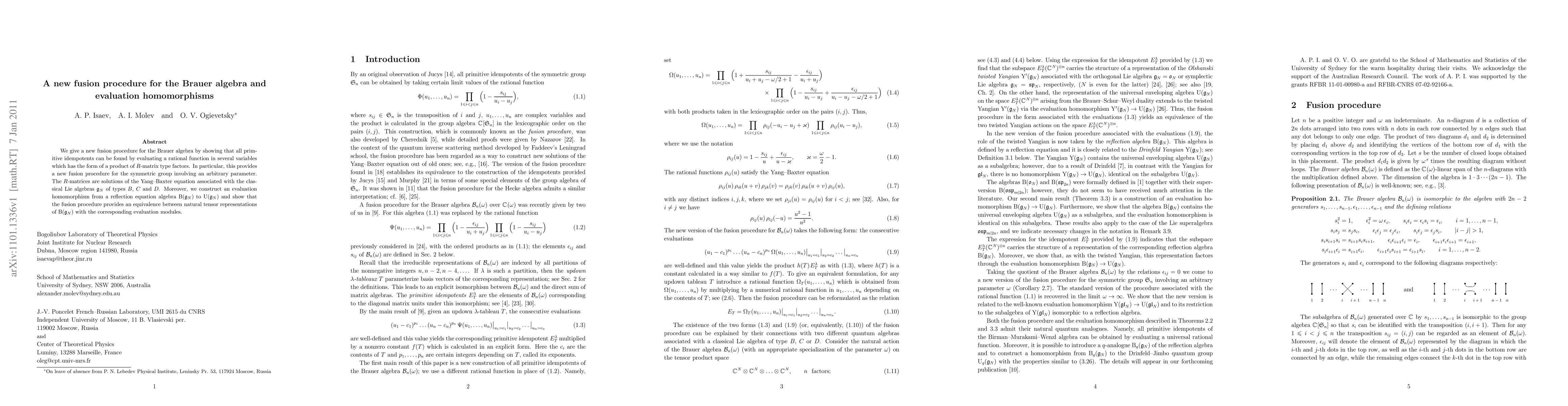 The paper introduces a novel fusion procedure for the Brauer algebra utilizing rational functions composed of R-matrix type factors, offering a new framework for evaluating symmetric group representations with an arbitrary parameter. It also establishes an evaluation homomorphism from reflection equation algebras to universal enveloping algebras, linking tensor representations with evaluation modules.