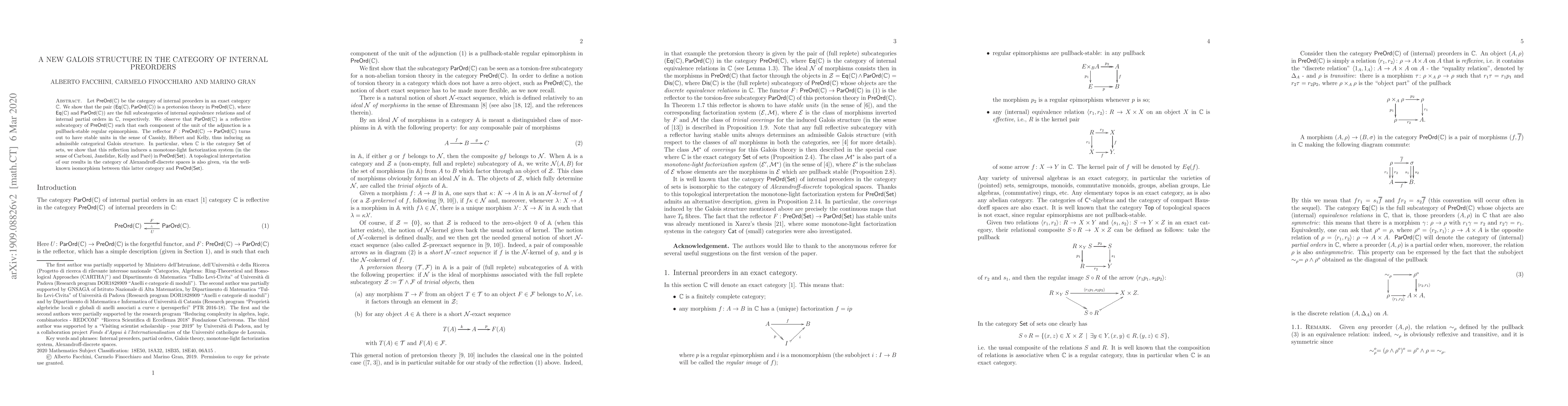 Researchers develop a new Galois structure in the category of internal preorders, showing that equivalence relations and partial orders form a pretorsion theory with reflective properties, enabling a categorical Galois interpretation.