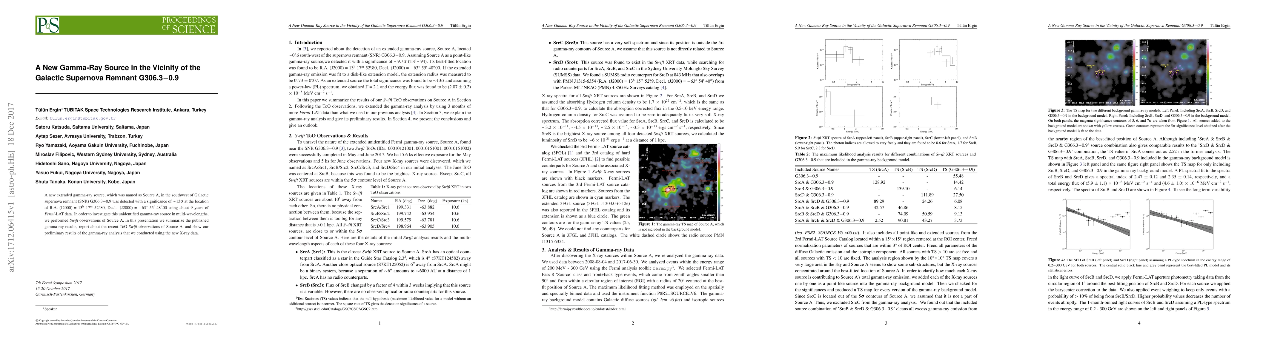 A new extended gamma-ray source, which was named as Source A, in the southwest of Galactic supernova remnant (SNR) G306.3$-$0.9 was detected with a significance of $\sim$13$\sigma$ at the location of R.A. (J2000) = 13$^{\rm{h}}$ 17$^{\rm{m}}$ 52$^{\rm{s}\!\!}$.80, Decl. (J2000) = $-$63$^{\circ}$ 55$'$ 48$"\!\!$.00 using about 9 years of Fermi-LAT data. In order to investigate this unidentified gamma-ray source in multi-wavelengths, we performed Swift observations of Source A. In this presentation we summarize the published gamma-ray results, report about the recent ToO Swift observations of Source A, and show our preliminary results of the gamma-ray analysis that we conducted using the new X-ray data.