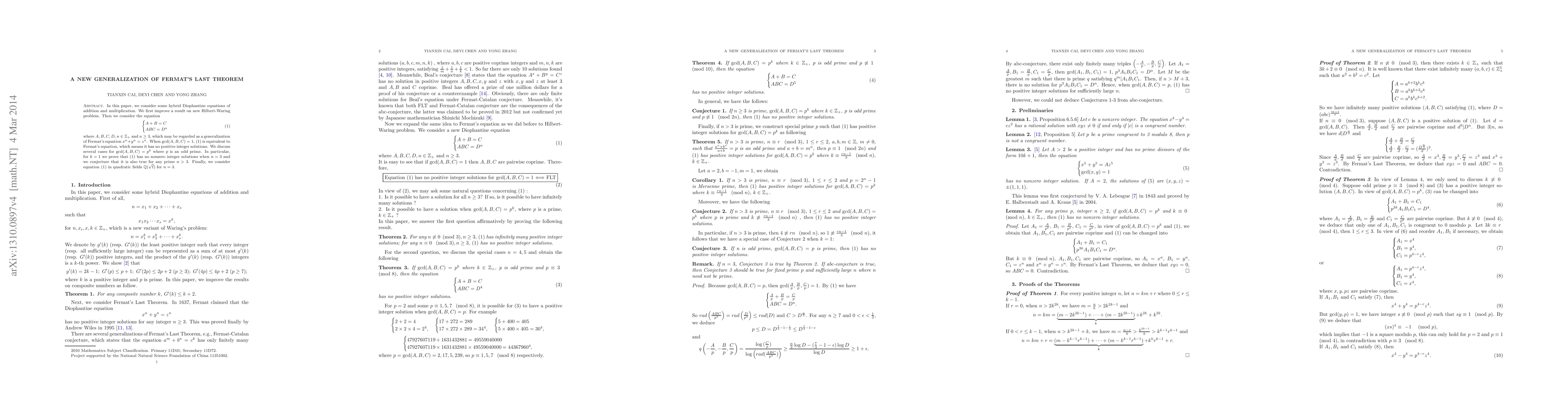 In this paper, we consider some hybrid Diophantine equations of addition and multiplication. We first improve a result on new Hilbert-Waring problem. Then we consider the equation \begin{equation} \begin{cases} A+B=C ABC=D^n \end{cases} \end{equation} where $A,B,C,D,n \in\ZZ_{+}$ and $n\geq3$, which may be regarded as a generalization of Fermat's equation $x^n+y^n=z^n$. When $\gcd(A,B,C)=1$, $(1)$ is equivalent to Fermat's equation, which means it has no positive integer solutions. We discuss several cases for $\gcd(A,B,C)=p^k$ where $p$ is an odd prime. In particular, for $k=1$ we prove that $(1)$ has no nonzero integer solutions when $n=3$ and we conjecture that it is also true for any prime $n>3$. Finally, we consider equation $(1)$ in quadratic fields $\mathbb{Q}(\sqrt{t})$ for $n=3$.