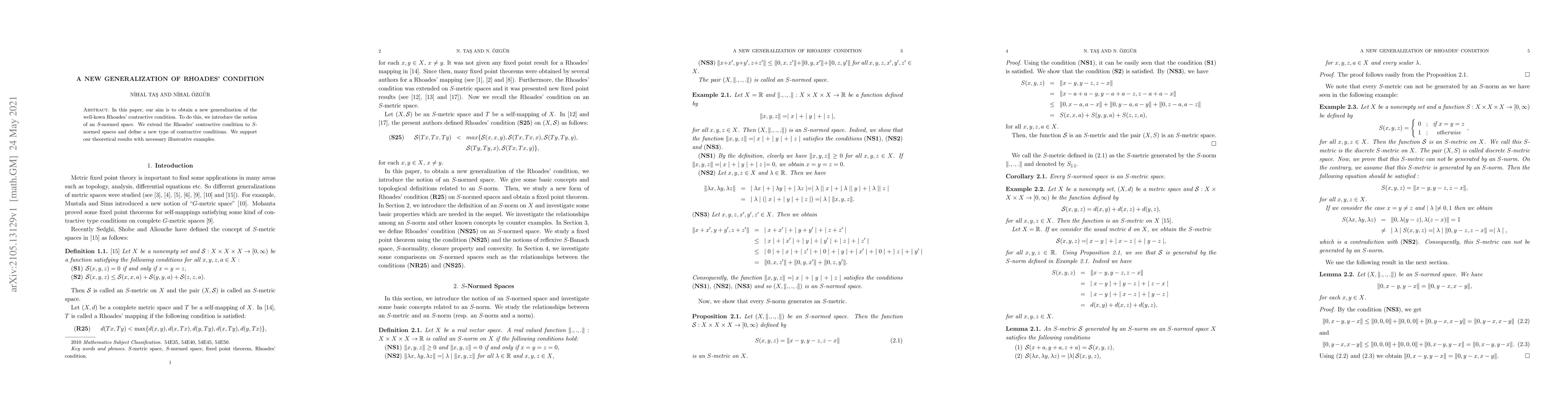 In this paper, our aim is to obtain a new generalization of the well-kown Rhoades' contractive condition. To do this, we introduce the notion of an $S$-normed space. We extend the Rhoades' contractive condition to $S$-normed spaces and define a new type of contractive conditions. We support our theoretical results with necessary illustrative examples.