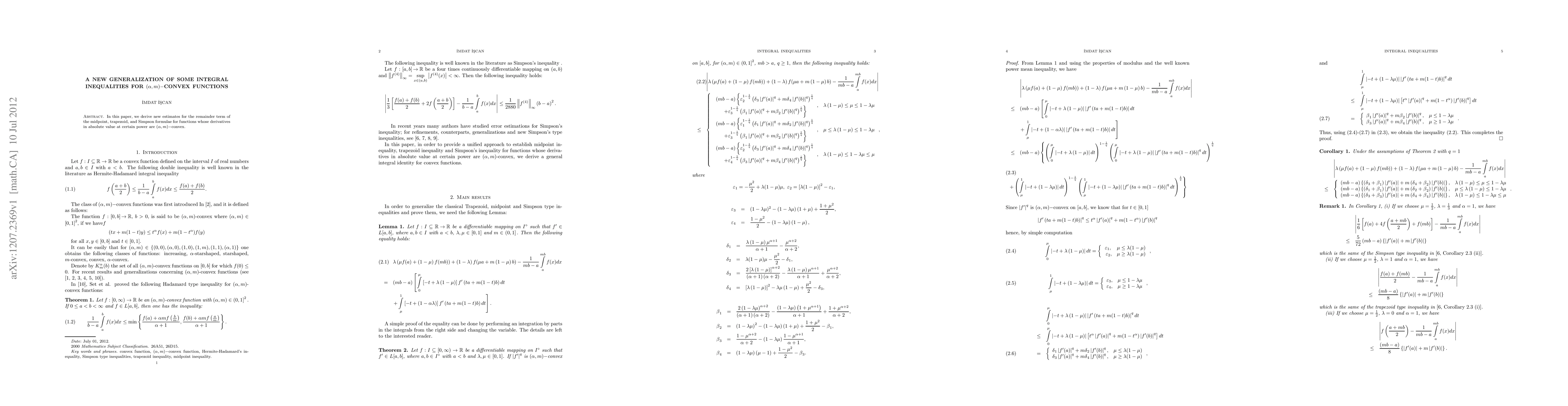 In this paper, we derive new estimates for the remainder term of the midpoint, trapezoid, and Simpson formulae for functions whose derivatives in absolute value at certain power are ({\alpha},m)-convex.