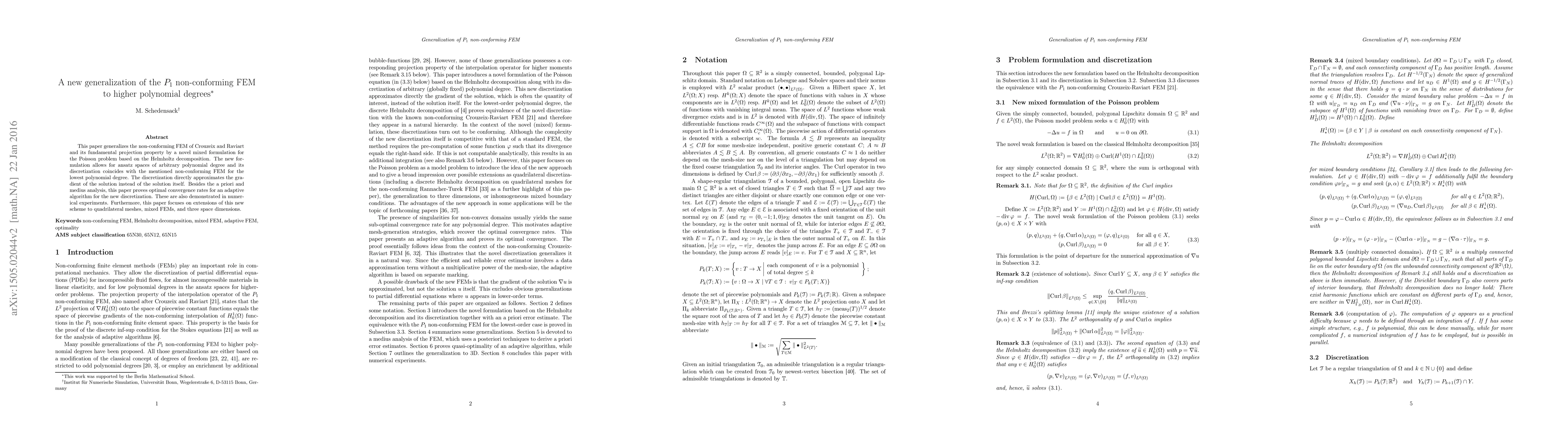 This paper generalizes the non-conforming FEM of Crouzeix and Raviart and its fundamental projection property by a novel mixed formulation for the Poisson problem based on the Helmholtz decomposition. The new formulation allows for ansatz spaces of arbitrary polynomial degree and its discretization coincides with the mentioned non-conforming FEM for the lowest polynomial degree. The discretization directly approximates the gradient of the solution instead of the solution itself. Besides the a priori and medius analysis, this paper proves optimal convergence rates for an adaptive algorithm for the new discretization. These are also demonstrated in numerical experiments. Furthermore, this paper focuses on extensions of this new scheme to quadrilateral meshes, mixed FEMs, and three space dimensions.