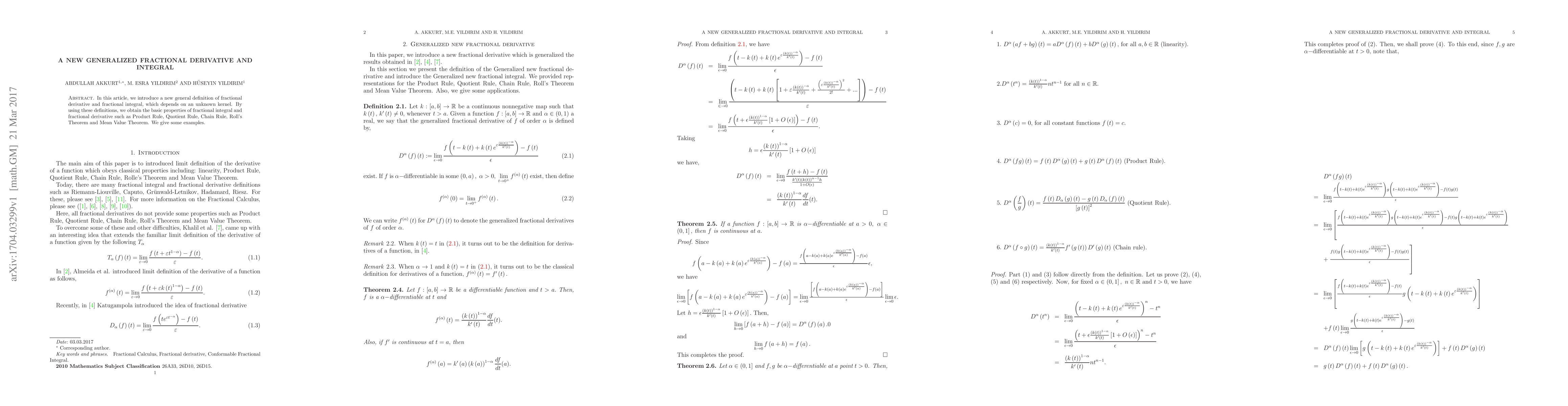 This paper presents a novel generalized definition of fractional derivatives and integrals based on an unknown kernel, and explores fundamental properties including the Product Rule, Quotient Rule, Chain Rule, Roll's Theorem, and Mean Value Theorem, supplemented by illustrative examples.