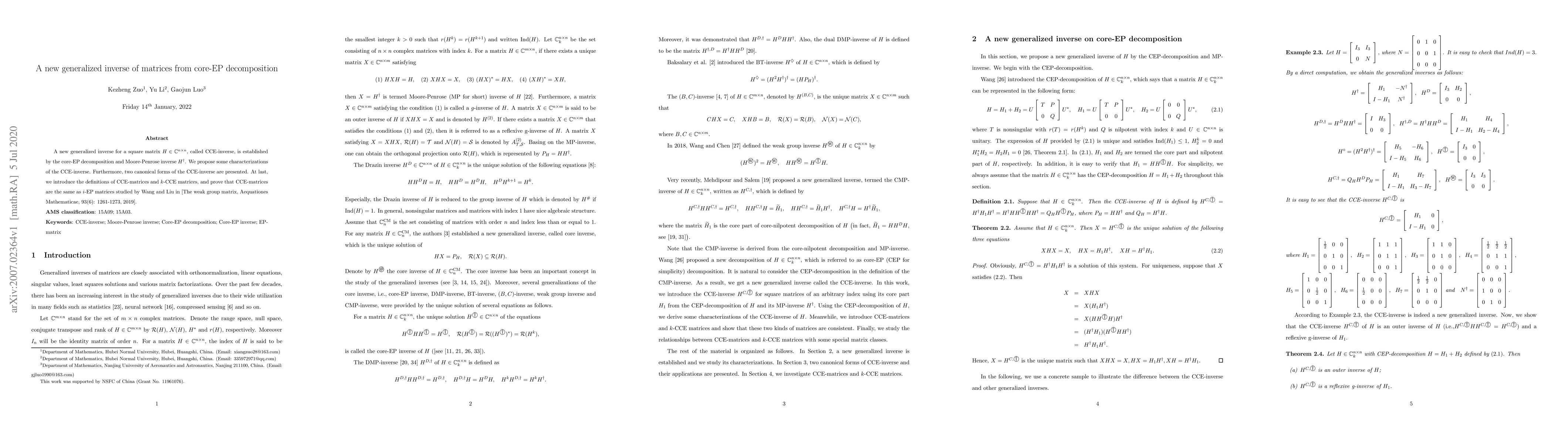 This research introduces the CCE-inverse for square matrices using core-EP decomposition and the Moore-Penrose inverse, providing characterizations and canonical forms. It also equates CCE-matrices with i-EP matrices, advancing matrix theory.