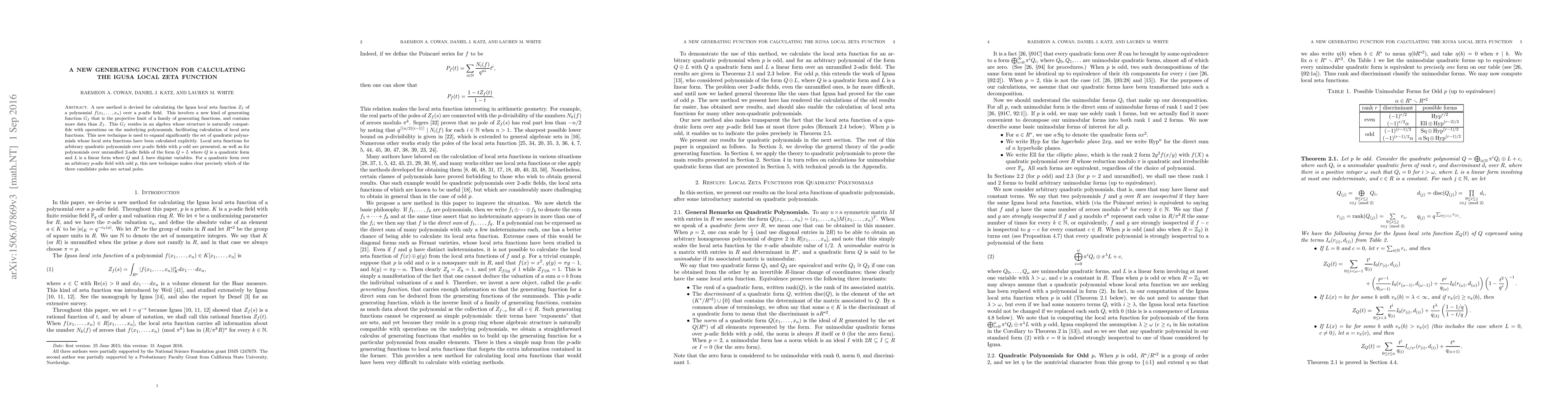 A new method is devised for calculating the Igusa local zeta function $Z_f$ of a polynomial $f(x_1,\dots,x_n)$ over a $p$-adic field. This involves a new kind of generating function $G_f$ that is the projective limit of a family of generating functions, and contains more data than $Z_f$. This $G_f$ resides in an algebra whose structure is naturally compatible with operations on the underlying polynomials, facilitating calculation of local zeta functions. This new technique is used to expand significantly the set of quadratic polynomials whose local zeta functions have been calculated explicitly. Local zeta functions for arbitrary quadratic polynomials over $p$-adic fields with $p$ odd are presented, as well as for polynomials over unramified $2$-adic fields of the form $Q+L$ where $Q$ is a quadratic form and $L$ is a linear form where $Q$ and $L$ have disjoint variables. For a quadratic form over an arbitrary $p$-adic field with odd $p$, this new technique makes clear precisely which of the three candidate poles are actual poles.