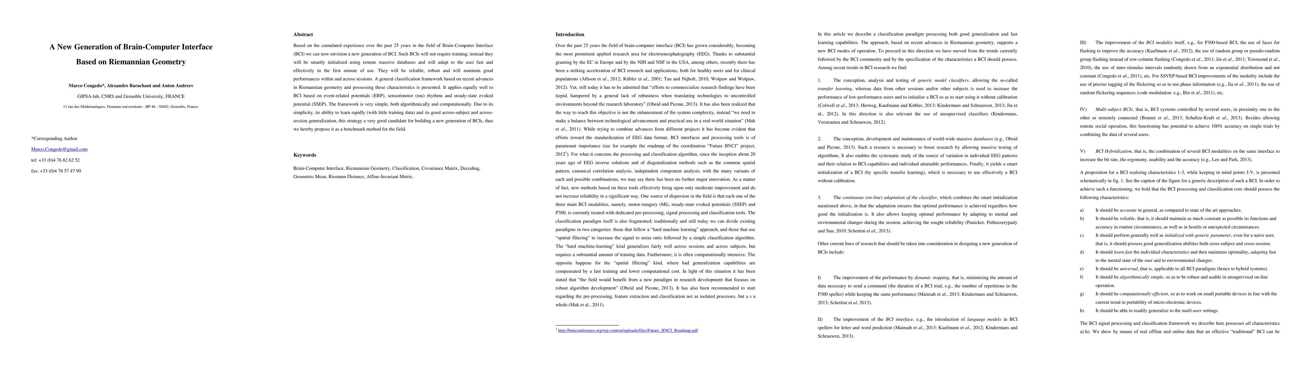 Based on the cumulated experience over the past 25 years in the field of Brain-Computer Interface (BCI) we can now envision a new generation of BCI. Such BCIs will not require training; instead they will be smartly initialized using remote massive databases and will adapt to the user fast and effectively in the first minute of use. They will be reliable, robust and will maintain good performances within and across sessions. A general classification framework based on recent advances in Riemannian geometry and possessing these characteristics is presented. It applies equally well to BCI based on event-related potentials (ERP), sensorimotor (mu) rhythms and steady-state evoked potential (SSEP). The framework is very simple, both algorithmically and computationally. Due to its simplicity, its ability to learn rapidly (with little training data) and its good across-subject and across-session generalization, this strategy a very good candidate for building a new generation of BCIs, thus we hereby propose it as a benchmark method for the field.