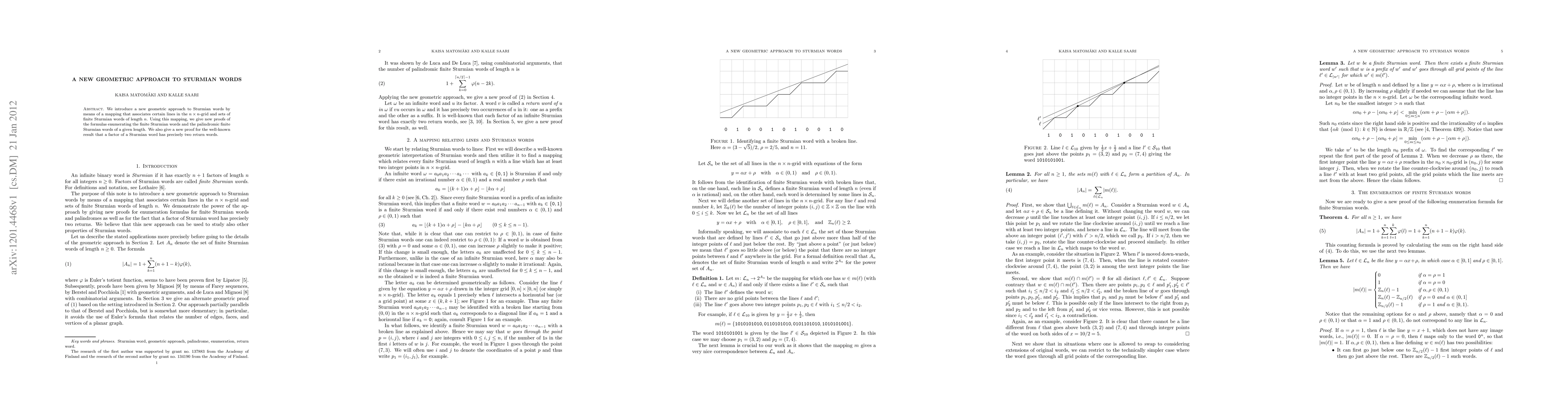 This paper presents a novel geometric approach to Sturmian words, mapping lines in an n x n grid to finite Sturmian words of length n, providing new proofs for formulas enumerating these words and demonstrating that a factor of a Sturmian word has exactly two return words.