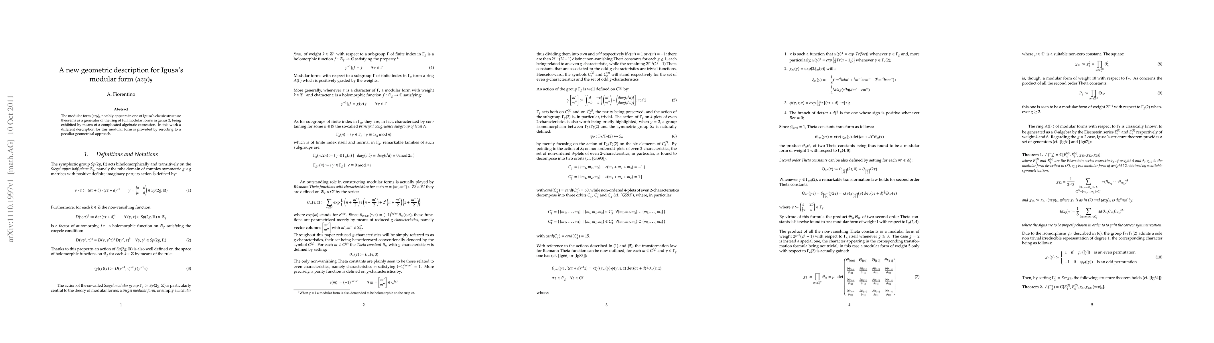 The modular form $(azy)_5$ notably appears in one of Igusa's classic structure theorems as a generator of the ring of full modular forms in genus 2, being exhibited by means of a complicated algebraic expression. In this work a different description for this modular form is provided by resorting to a peculiar geometrical approach.