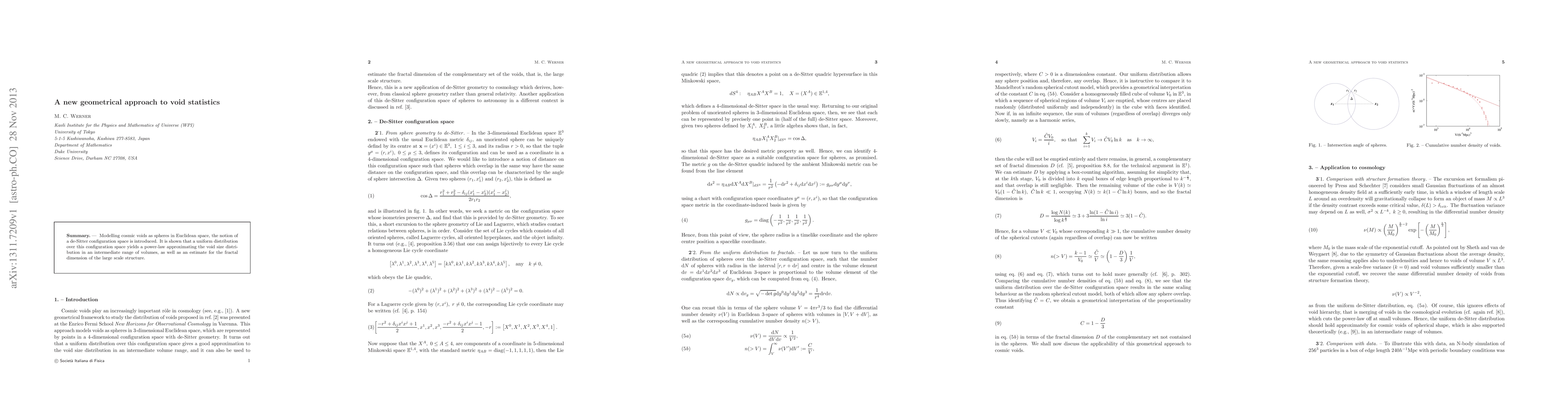 This paper proposes a new geometrical method to model cosmic voids as spheres, introducing a de-Sitter configuration space. It demonstrates that a uniform distribution over this space approximates the void size distribution and estimates the fractal dimension of large-scale structures.