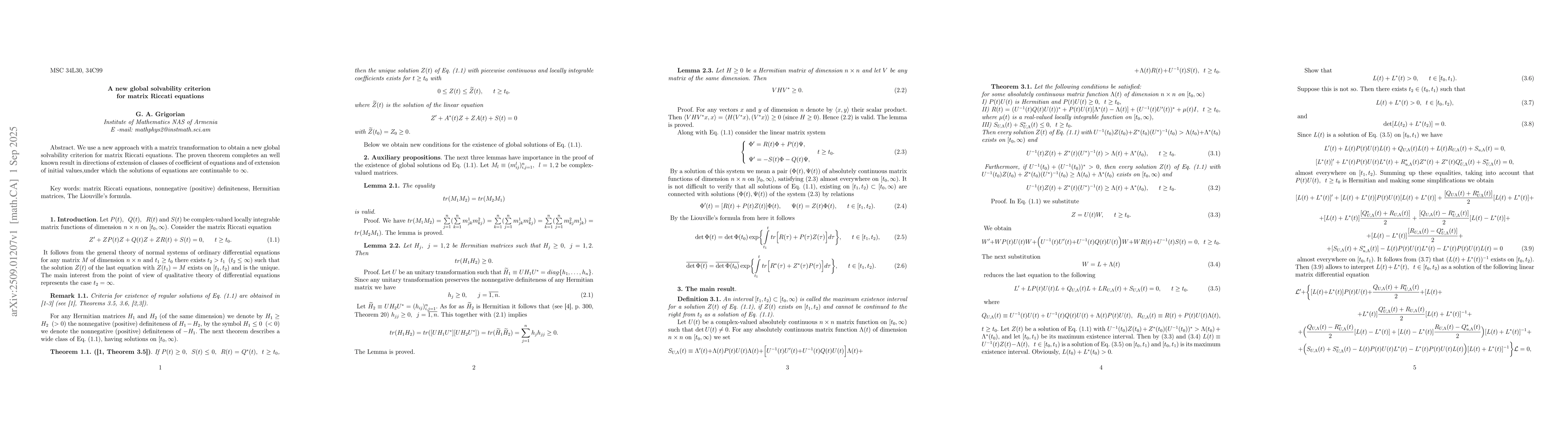 We use a new approach with a matrix transformation to obtain a new global solvability criterion for matrix Riccati equations. The proven theorem completes an well known result in directions of extension of classes of coefficient of equations and of extension of initial values,under which the solutions of equations are continuable to $\infty$.