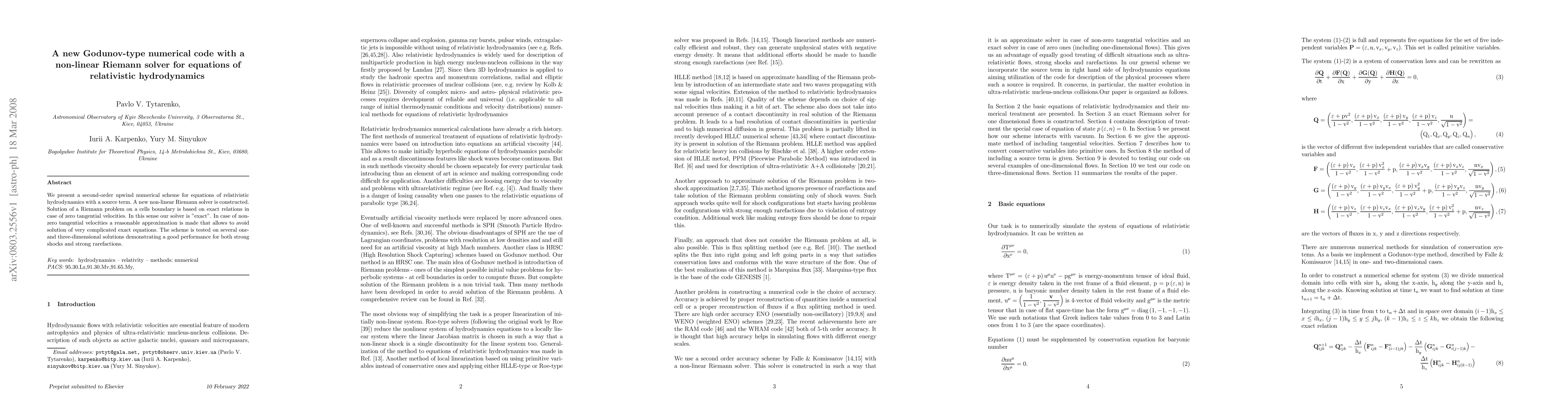 We present a second-order upwind numerical scheme for equations of relativistic hydrodynamics with a source term. A new non-linear Riemann solver is constructed. Solution of a Riemann problem on a cells boundary is based on exact relations in case of zero tangential velocities. In this sense our solver is "exact". In case of non-zero tangential velocities a reasonable approximation is made that allows to avoid solution of very complicated exact equations. The scheme is tested on several one- and three-dimensional solutions demonstrating a good performance for both strong shocks and strong rarefactions.
