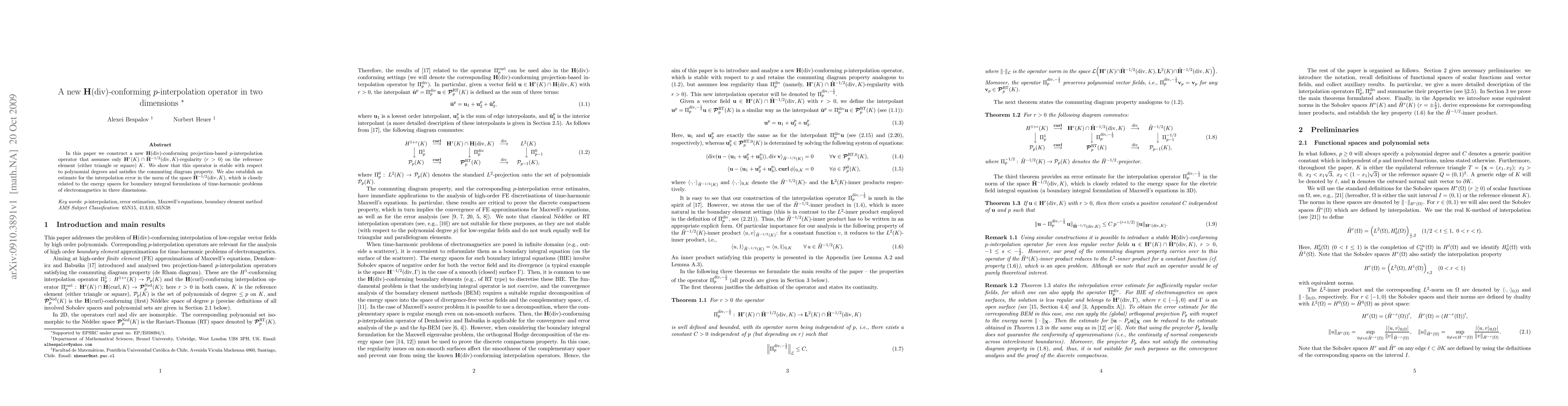 This paper introduces a new H(div)-conforming p-interpolation operator that requires minimal regularity assumptions and maintains stability across polynomial degrees. It also satisfies the commuting diagram property and provides an error estimate in the $\tilde H^{-1/2}(div,K)$ norm, relevant for electromagnetic boundary integral methods.