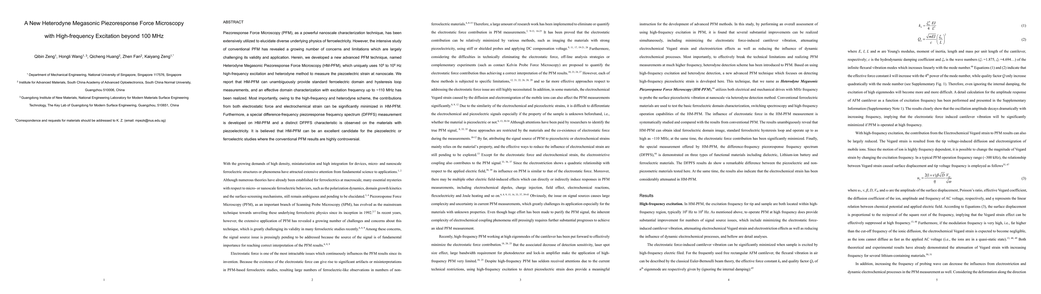 Piezoresponse Force Microscopy (PFM), as a powerful nanoscale characterization technique, has been extensively utilized to elucidate diverse underlying physics of ferroelectricity. However, the intensive study of conventional PFM has revealed a growing number of concerns and limitations which are largely challenging its validity and application. Herein, we developed a new advanced PFM technique, named Heterodyne Megasonic Piezoresponse Force Microscopy (HM-PFM), which uniquely uses 106 to 108 Hz high-frequency excitation and heterodyne method to measure the piezoelectric strain at nanoscale. We report that HM-PFM can unambiguously provide standard ferroelectric domain and hysteresis loop measurements, and an effective domain characterization with excitation frequency up to ~110 MHz has been realized. Most importantly, owing to the high-frequency and heterodyne scheme, the contributions from both electrostatic force and electrochemical strain can be significantly minimized in HM-PFM. Furthermore, a special difference-frequency piezoresponse frequency spectrum (DFPFS) measurement is developed on HM-PFM and a distinct DFPFS characteristic is observed on the materials with piezoelectricity. It is believed that HM-PFM can be an excellent candidate for the piezoelectric or ferroelectric studies where the conventional PFM results are highly controversial.
