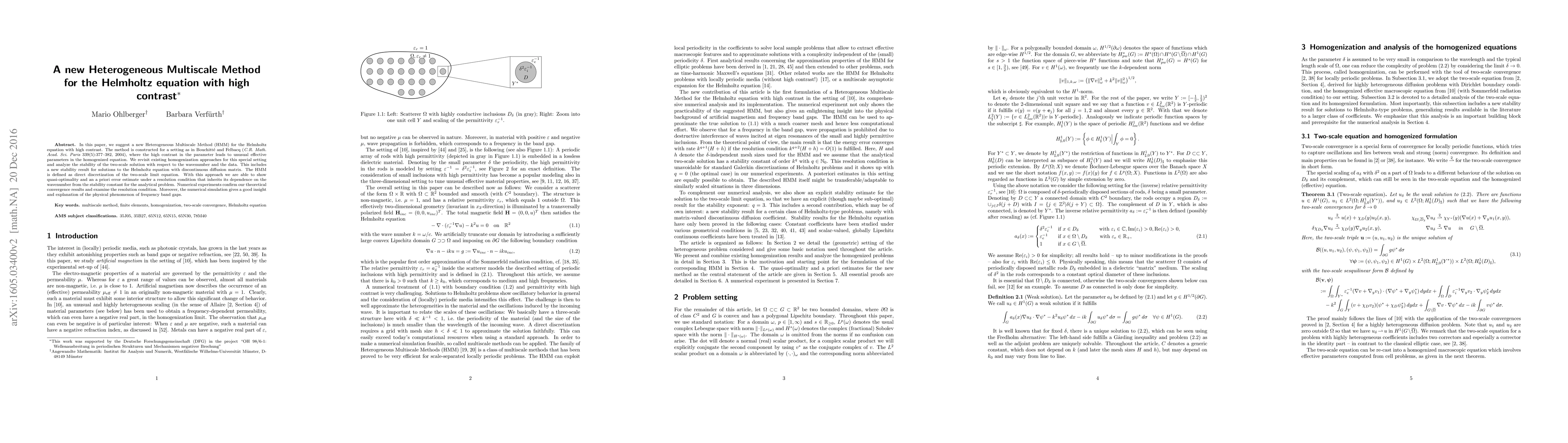 In this paper, we suggest a new Heterogeneous Multiscale Method (HMM) for the Helmholtz equation with high contrast. The method is constructed for a setting as in Bouchitt\'e and Felbacq (C.R. Math. Acad. Sci. Paris 339(5):377--382, 2004), where the high contrast in the parameter leads to unusual effective parameters in the homogenized equation. We revisit existing homogenization approaches for this special setting and analyze the stability of the two-scale solution with respect to the wavenumber and the data. This includes a new stability result for solutions to the Helmholtz equation with discontinuous diffusion matrix. The HMM is defined as direct discretization of the two-scale limit equation. With this approach we are able to show quasi-optimality and an a priori error estimate under a resolution condition that inherits its dependence on the wavenumber from the stability constant for the analytical problem. Numerical experiments confirm our theoretical convergence results and examine the resolution condition. Moreover, the numerical simulation gives a good insight and explanation of the physical phenomenon of frequency band gaps.