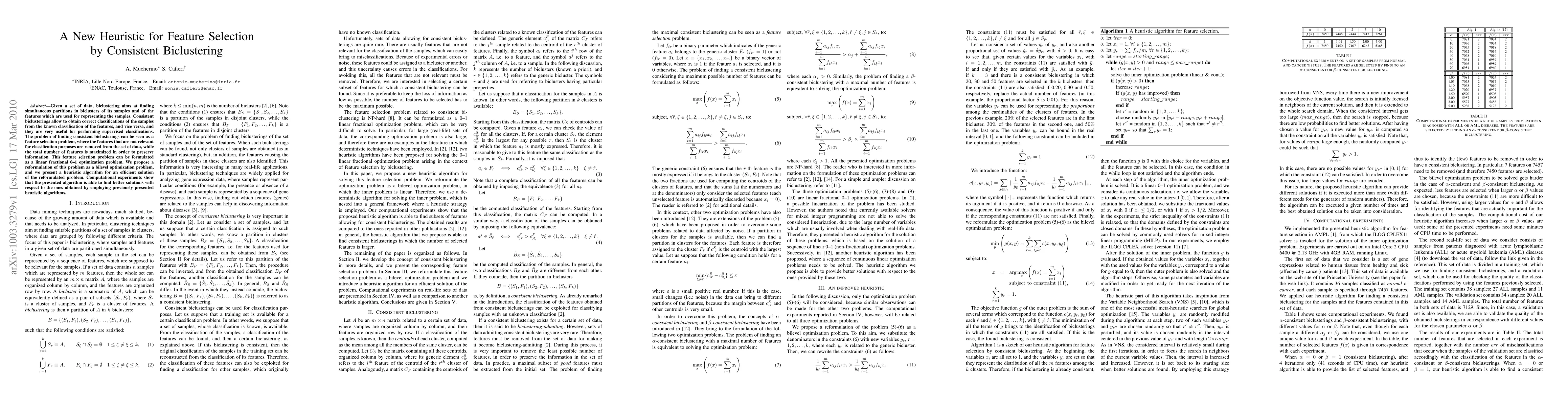 A new heuristic algorithm is proposed for feature selection through consistent biclustering, outperforming existing methods in computational experiments.