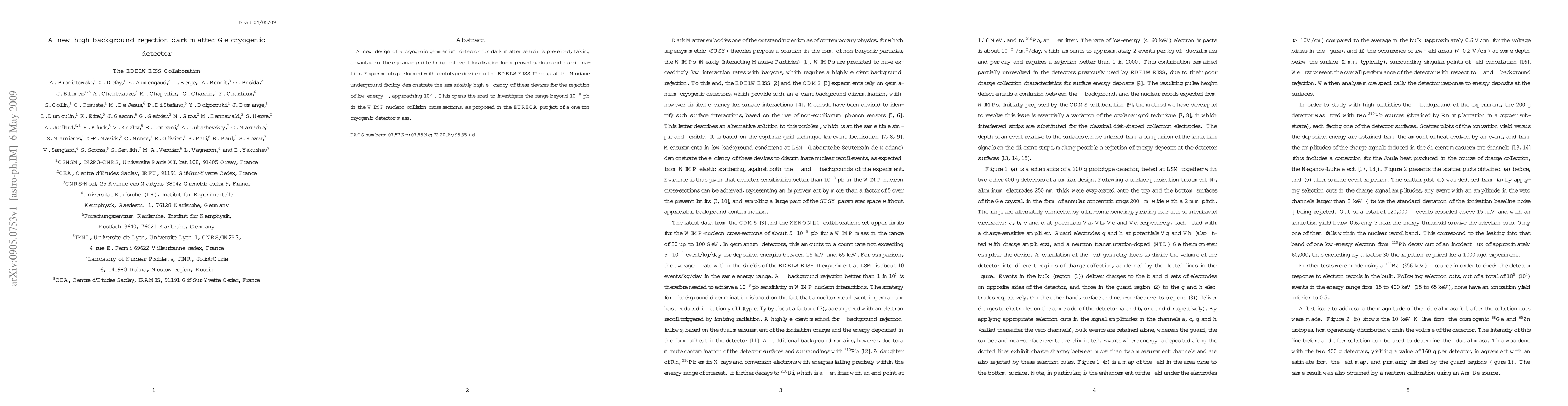 A new design of a cryogenic germanium detector for dark matter search is presented, taking advantage of the coplanar grid technique of event localisation for improved background discrimination. Experiments performed with prototype devices in the EDELWEISS II setup at the Modane underground facility demonstrate the remarkably high efficiency of these devices for the rejection of low-energy $\beta$, approaching 10$^5$ . This opens the road to investigate the range beyond 10$^{-8}$ pb in the WIMP-nucleon collision cross-sections, as proposed in the EURECA project of a one-ton cryogenic detector mass.