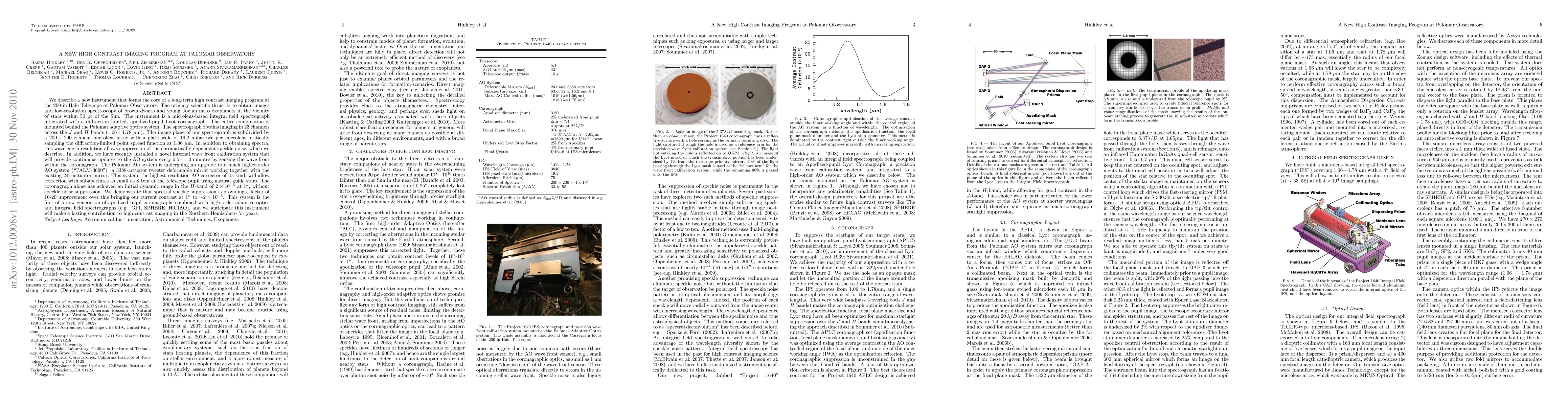 We describe a new instrument that forms the core of a long-term high contrast imaging program at the 200-inch Hale Telescope at Palomar Observatory. The primary scientific thrust is to obtain images and low-resolution spectroscopy of brown dwarfs and young Jovian mass exoplanets in the vicinity of stars within 50 parsecs of the Sun. The instrument is a microlens-based integral field spectrograph integrated with a diffraction limited, apodized-pupil Lyot coronagraph, mounted behind the Palomar adaptive optics system. The spectrograph obtains imaging in 23 channels across the J and H bands (1.06 - 1.78 microns). In addition to obtaining spectra, this wavelength resolution allows suppression of the chromatically dependent speckle noise, which we describe. We have recently installed a novel internal wave front calibration system that will provide continuous updates to the AO system every 0.5 - 1.0 minutes by sensing the wave front within the coronagraph. The Palomar AO system is undergoing an upgrade to a much higher-order AO system ("PALM-3000"): a 3388-actuator tweeter deformable mirror working together with the existing 241-actuator mirror. This system will allow correction with subapertures as small as 8cm at the telescope pupil using natural guide stars. The coronagraph alone has achieved an initial dynamic range in the H-band of 2 X 10^-4 at 1 arcsecond, without speckle noise suppression. We demonstrate that spectral speckle suppression is providing a factor of 10-20 improvement over this bringing our current contrast at an arcsecond to ~2 X 10^-5. This system is the first of a new generation of apodized pupil coronagraphs combined with high-order adaptive optics and integral field spectrographs (e.g. GPI, SPHERE, HiCIAO), and we anticipate this instrument will make a lasting contribution to high contrast imaging in the Northern Hemisphere for years.
