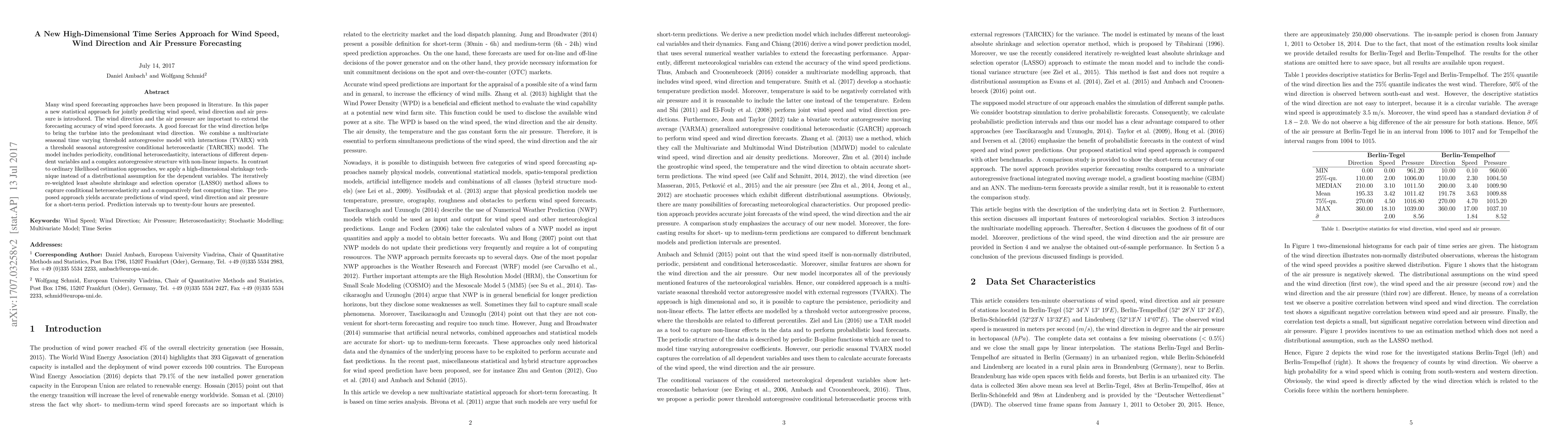 This paper introduces a new statistical approach combining multivariate seasonal TVARX and TARCHX models to jointly forecast wind speed, wind direction, and air pressure. The method uses high-dimensional shrinkage via LASSO for efficient computation, yielding accurate short-term predictions and prediction intervals up to 24 hours.