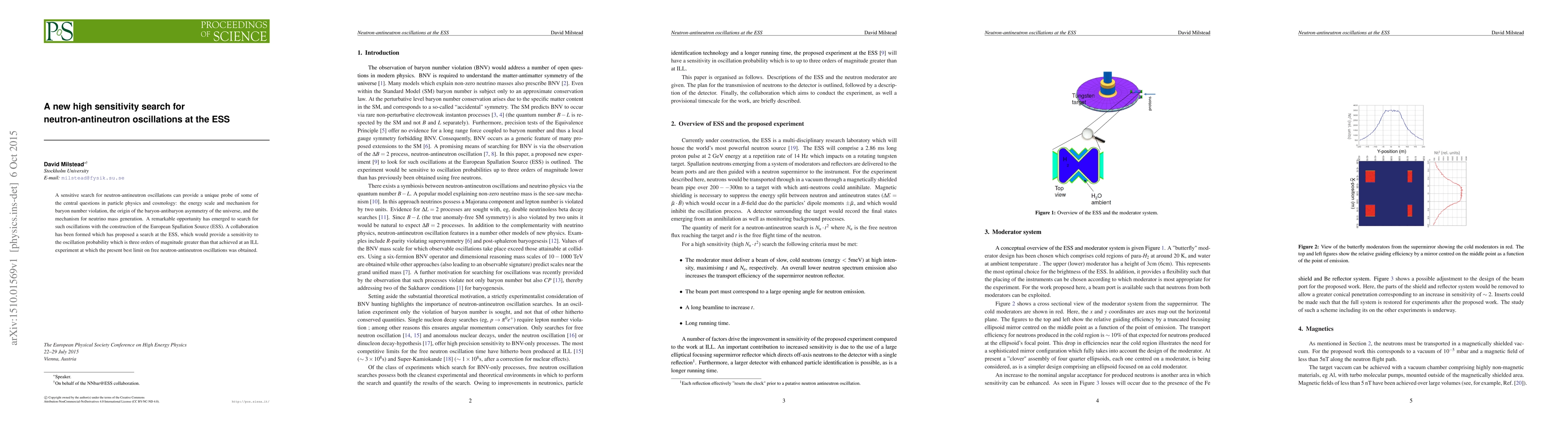 The research proposes a high-sensitivity search for neutron-antineutron oscillations at the European Spallation Source (ESS), utilizing a powerful neutron source, magnetic shielding, and a sophisticated detector system.