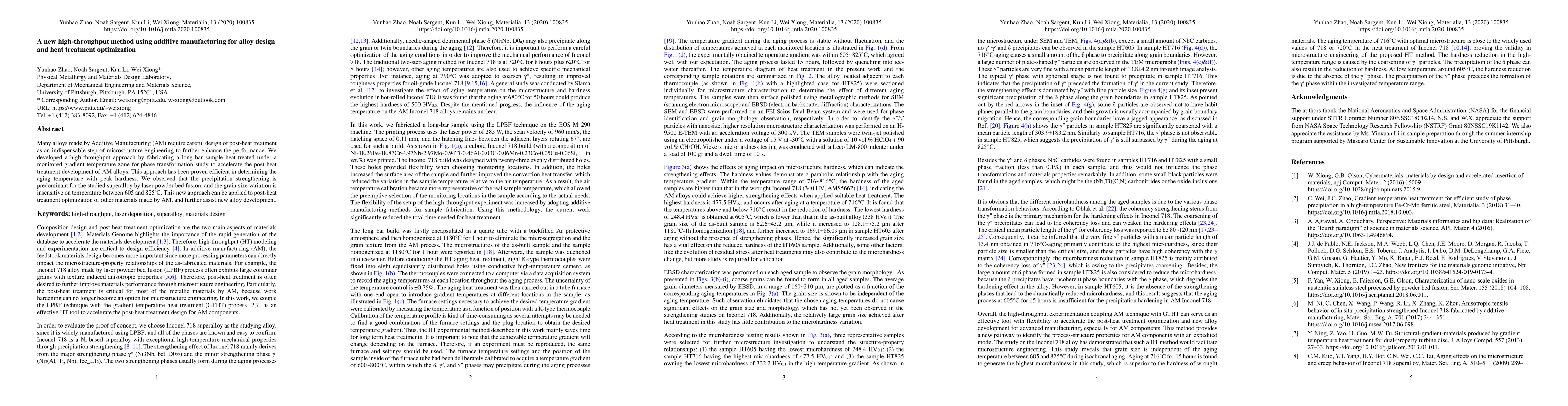 This paper introduces a high-throughput method using additive manufacturing for optimizing post-heat treatment in alloy design, demonstrating its effectiveness in determining optimal aging temperature for peak hardness in superalloys. The method involves fabricating and heat-treating long-bar samples under a gradient temperature zone, showing that precipitation strengthening is key and grain size is temperature-insensitive in the studied range.