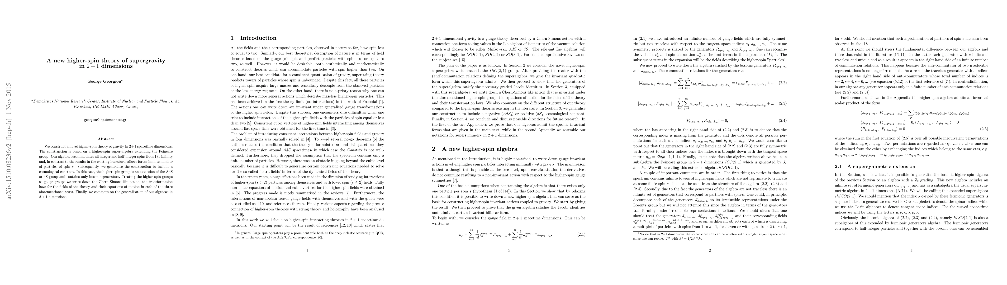 We construct a novel higher-spin theory of gravity in 2+1 spacetime dimensions. The construction is based on a higher-spin super-algebra extending the Poincare group. Our algebra accommodates all integer and half-integer spins from 1 to infinity and, in contrast to the results in the existing literature, allows for an infinite number of particles of spin s. Subsequently, we generalise the construction to include a cosmological constant. In this case, the higher-spin group is an extension of the AdS or dS group and contains only bosonic generators. Treating the higher-spin groups as gauge groups we write down the Chern-Simons like action, the transformation laws for the fields of the theory and their equations of motion in each of the three aforementioned cases. Finally, we comment on the generalisation of our algebras in $d+1$ dimensions.