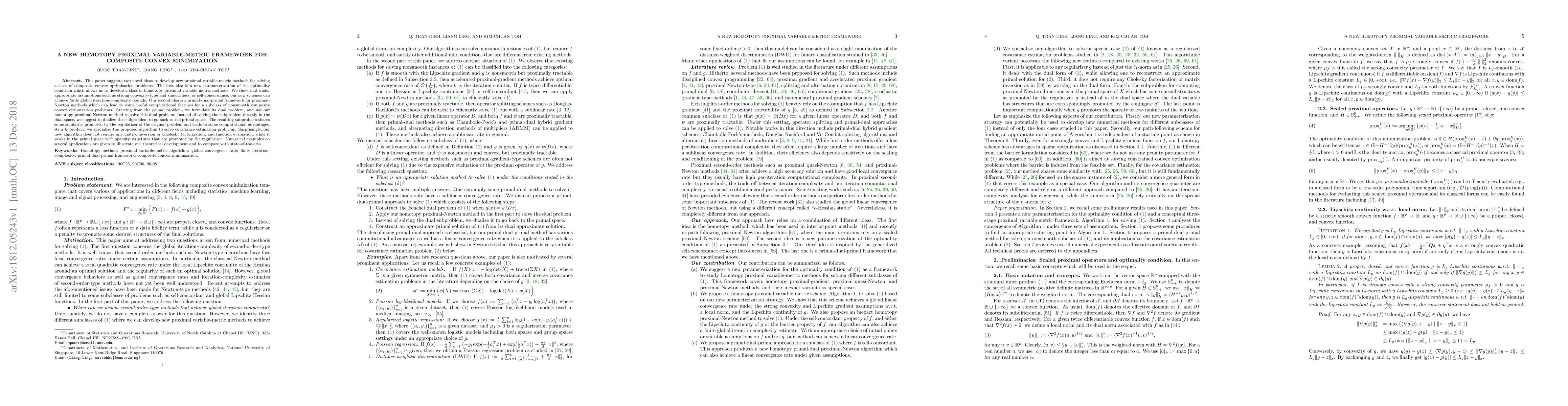 This paper introduces a new homotopy proximal variable-metric framework for composite convex minimization, achieving finite global iteration-complexity bounds under strong convexity and smoothness assumptions. The proposed primal-dual-primal approach avoids matrix inversions and leverages sparsity structures, demonstrated through numerical examples and applications like covariance estimation.