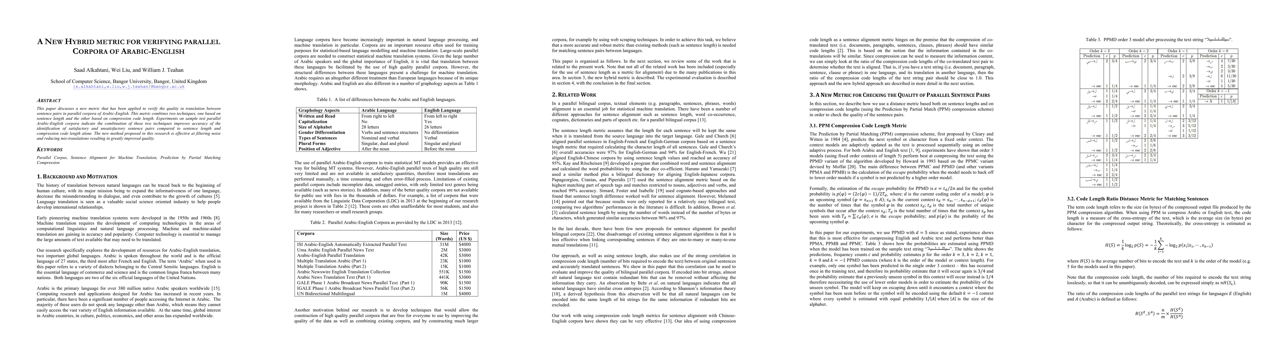 This paper introduces a hybrid metric combining sentence length and compression code length to verify the quality of Arabic-English parallel corpora translations. Experiments show this new approach significantly improves the accuracy of identifying satisfactory translations compared to using either technique alone.