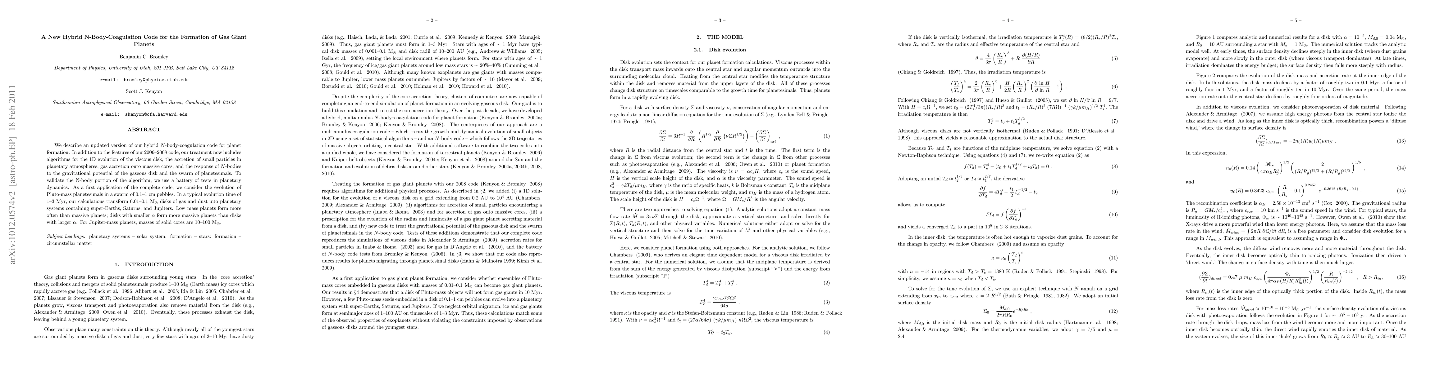 We describe an updated version of our hybrid N-body-coagulation code for planet formation. In addition to the features of our 2006-2008 code, our treatment now includes algorithms for the 1D evolution of the viscous disk, the accretion of small particles in planetary atmospheres, gas accretion onto massive cores, and the response of N-bodies to the gravitational potential of the gaseous disk and the swarm of planetesimals. To validate the N-body portion of the algorithm, we use a battery of tests in planetary dynamics. As a first application of the complete code, we consider the evolution of Pluto-mass planetesimals in a swarm of 0.1-1 cm pebbles. In a typical evolution time of 1-3 Myr, our calculations transform 0.01-0.1 solar mass disks of gas and dust into planetary systems containing super-Earths, Saturns, and Jupiters. Low mass planets form more often than massive planets; disks with smaller alpha form more massive planets than disks with larger alpha. For Jupiter-mass planets, masses of solid cores are 10-100 Earth masses.
