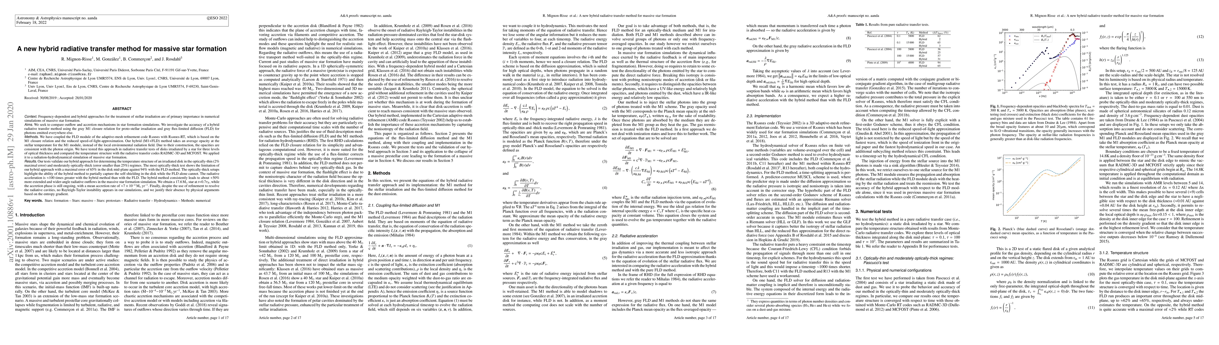 Frequency-dependent/hybrid approaches for stellar irradiation are of primary importance in numerical simulations of massive star formation. We seek to compare outflow and accretion mechanisms in star formation simulations. We investigate the accuracy of a hybrid radiative transfer method using the gray M1 closure relation for proto-stellar irradiation and gray flux-limited diffusion (FLD) for photons emitted everywhere else. We have coupled the FLD module of the adaptive-mesh refinement code Ramses with Ramses-RT, which is based on the M1 closure relation. Our hybrid (M1+FLD) method takes an average opacity at the stellar temperature for the M1 module, instead of the local environmental radiation field. We have tested this approach in radiative transfer tests of disks irradiated by a star for three levels of optical thickness and compared the temperature structure with RADMC-3D and MCFOST. We applied it to a radiation-hydrodynamical simulation of massive star formation. Our tests validate our hybrid approach for determining the temperature structure of an irradiated disk in the optically-thin and moderately optically-thick regimes and the most optically-thick test shows the limitation of our approach. The optically-thick setups highlight the ability of the hybrid method to partially capture the self-shielding in the disk while the FLD cannot. The radiative acceleration is 100 times greater with the hybrid method. It consistently leads to about +50% more extended and wider-angle radiative outflows in the massive star formation simulation. We obtain a $17.6 M_\odot$ at $t{\simeq}0.7 \tau_\mathrm{ff}$, while the accretion phase is ongoing. Finally, despite the use of refinement to resolve the radiative cavities, no Rayleigh-Taylor instability appears in our simulations, and we justify their absence by physical arguments based on the entropy gradient. (abridged)
