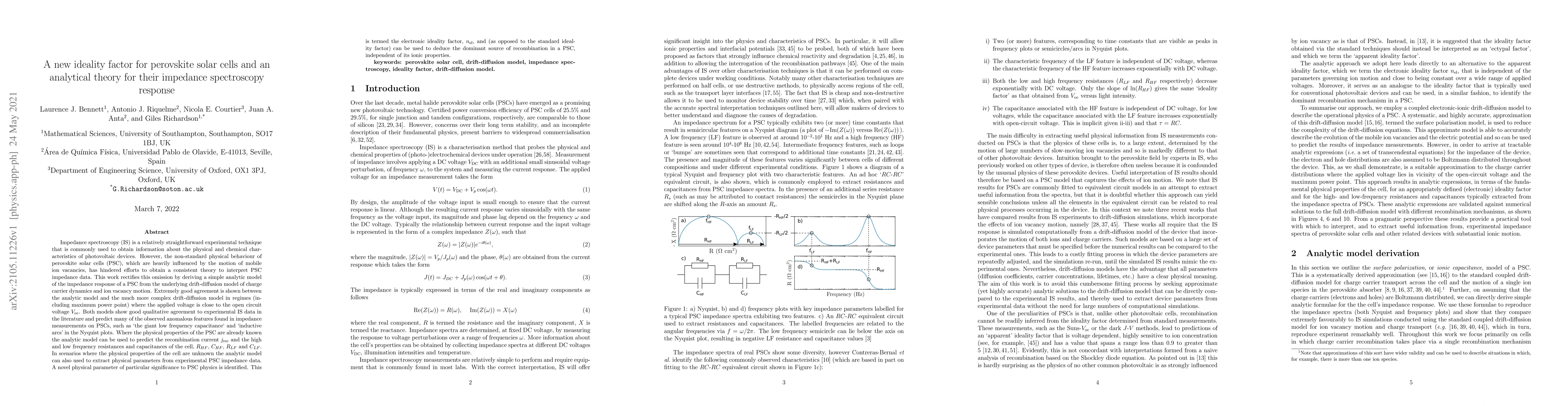 This paper presents an analytical model for interpreting impedance spectroscopy data of perovskite solar cells (PSC), addressing their unique physical behavior. It introduces a new electronic ideality factor, $n_{el}$, to identify the dominant recombination source in PSCs, independent of ionic properties, and shows excellent agreement with complex drift-diffusion models and experimental data.