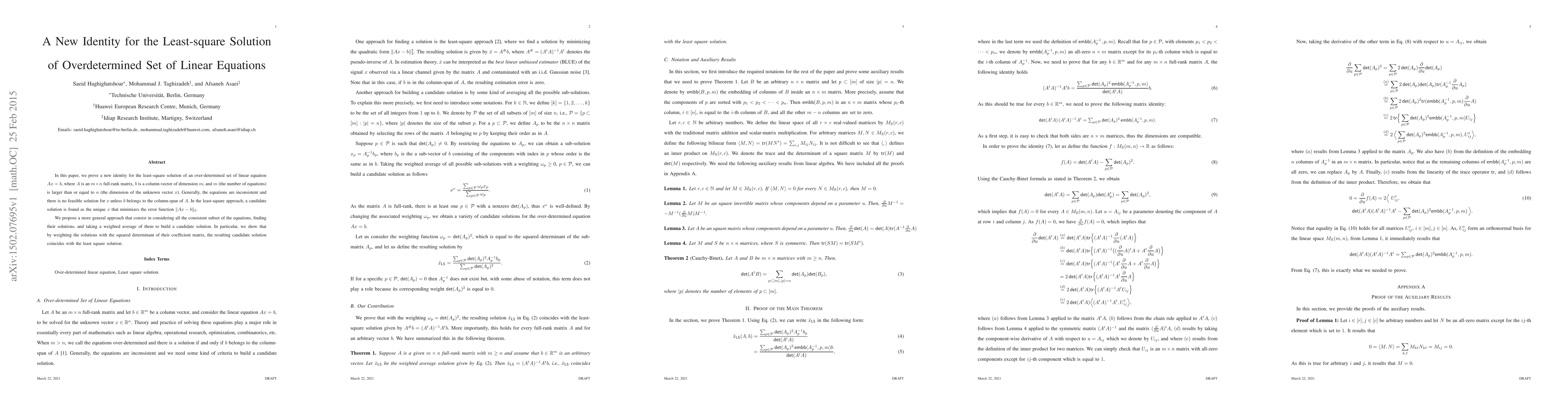 In this paper, we prove a new identity for the least-square solution of an over-determined set of linear equation $Ax=b$, where $A$ is an $m\times n$ full-rank matrix, $b$ is a column-vector of dimension $m$, and $m$ (the number of equations) is larger than or equal to $n$ (the dimension of the unknown vector $x$). Generally, the equations are inconsistent and there is no feasible solution for $x$ unless $b$ belongs to the column-span of $A$. In the least-square approach, a candidate solution is found as the unique $x$ that minimizes the error function $\|Ax-b\|_2$. We propose a more general approach that consist in considering all the consistent subset of the equations, finding their solutions, and taking a weighted average of them to build a candidate solution. In particular, we show that by weighting the solutions with the squared determinant of their coefficient matrix, the resulting candidate solution coincides with the least square solution.