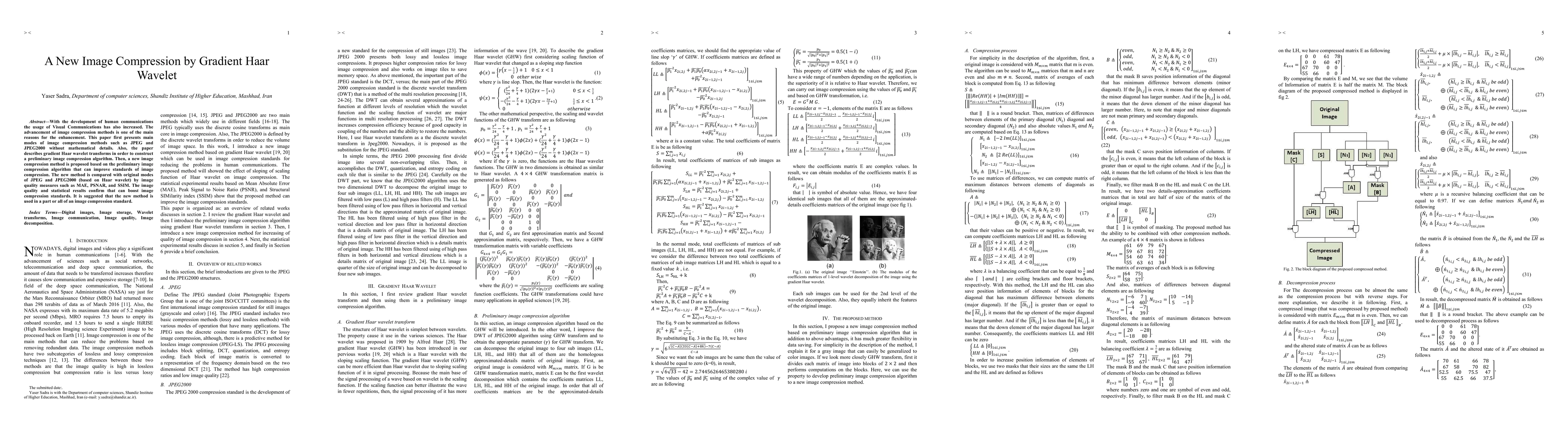This paper proposes a new image compression method using gradient Haar wavelet transforms, which improves upon existing JPEG and JPEG2000 standards. Comparative analysis using metrics like MAE, PSNR, and SSIM shows enhanced image quality, suggesting its potential integration into image compression standards.